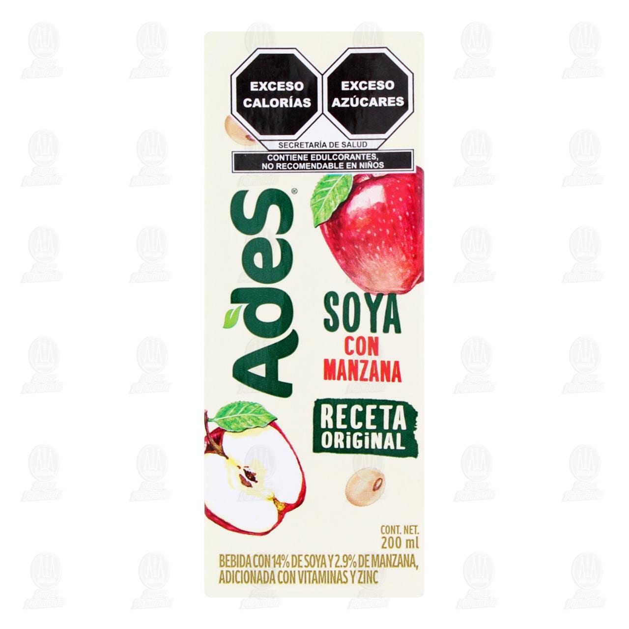 Bebida Ades Soya con 14% de Soya y 2.9% de Manzana, Adicionada con Vitaminas y Zinc. Envase con 200 mililitros.