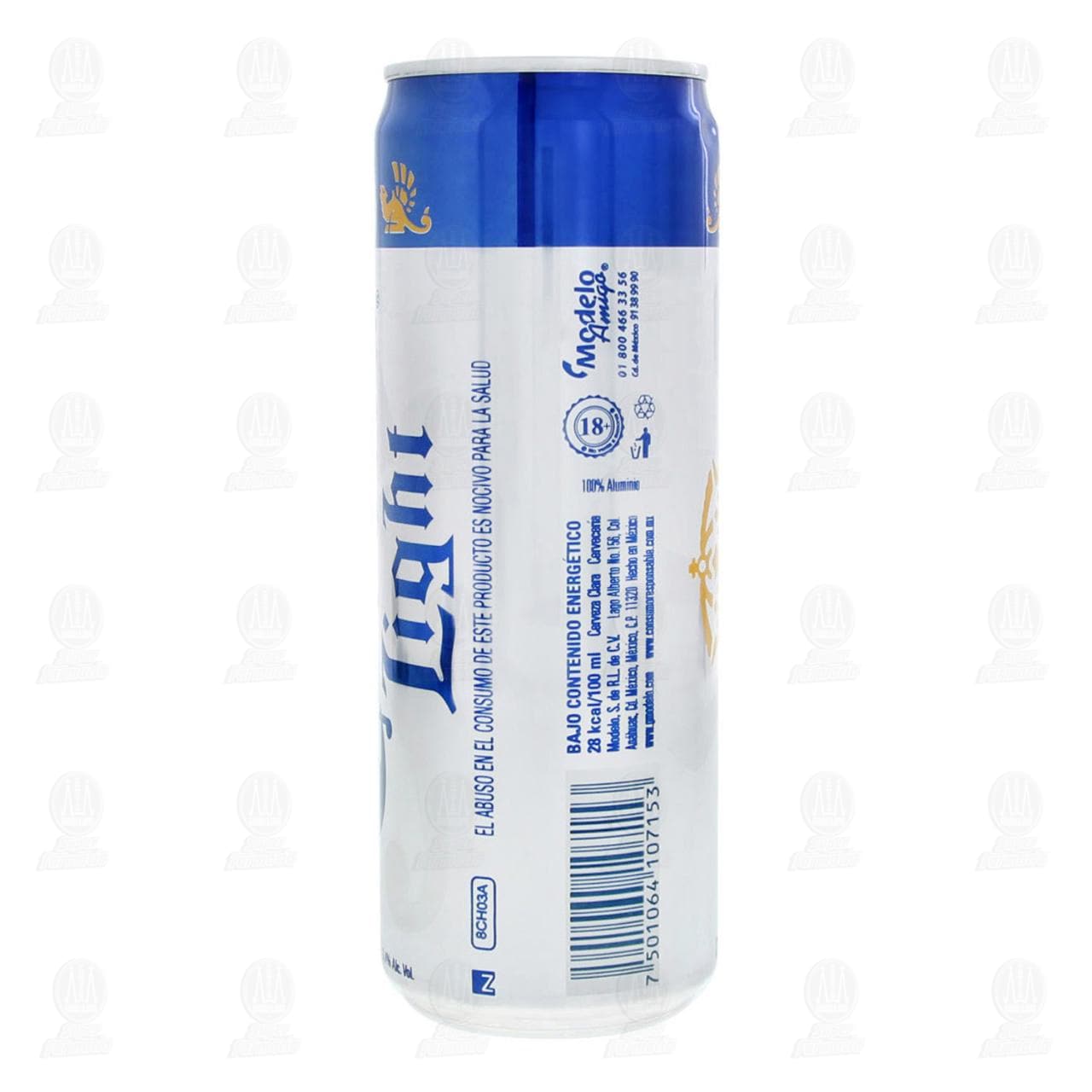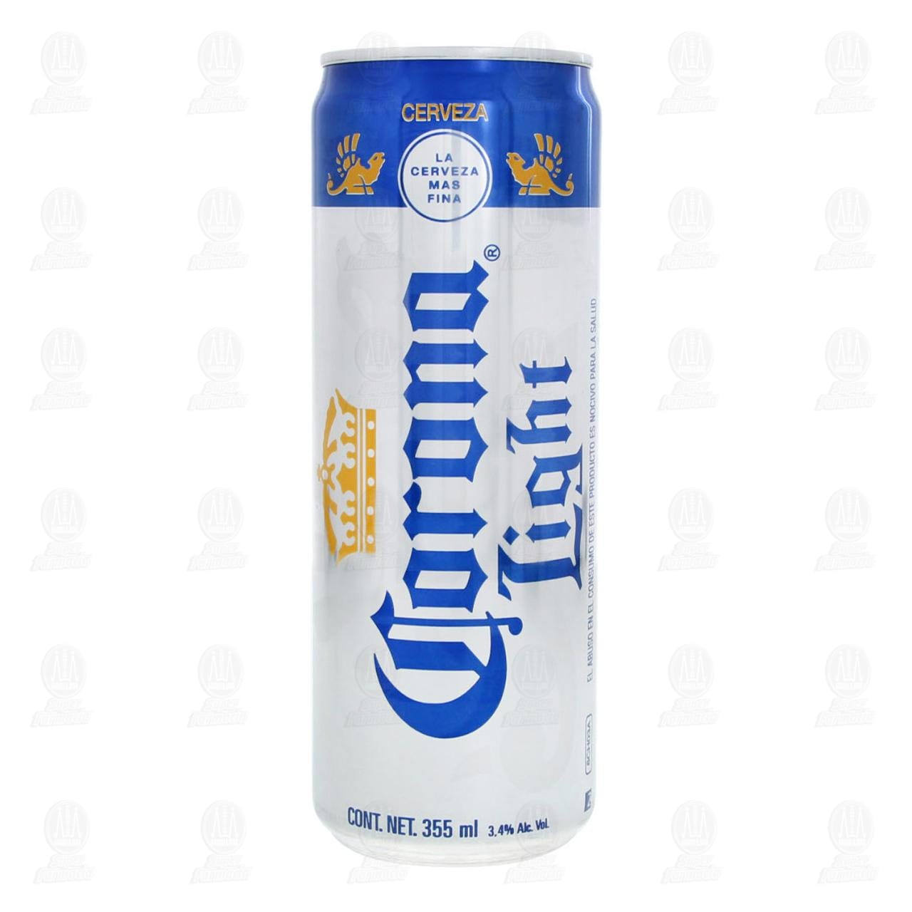 Cerveza Corona Light de cervecería Modelo. Lata de 355 mililitros con 3.4 % volumen de alcohol.