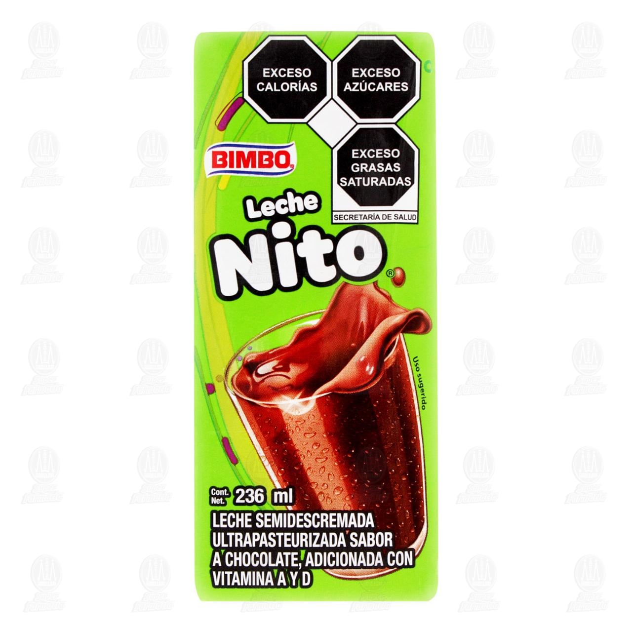 Leche semidescremada Bimbo Nito, ultrapasteurizada, sabor a chocolate, adicionada con vitaminas A y D. Envase con 236 mililitros.