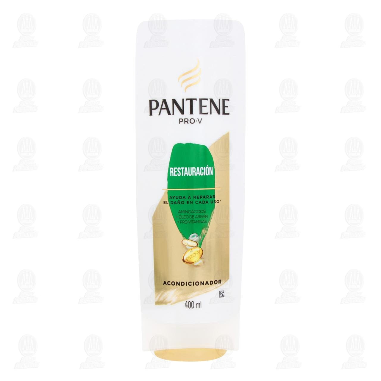 Acondicionador Pantene Pro-V Restauración, ayuda a reducir la pérdida de proteínas y a reparar las cutículas para prevenir las puntas abiertas, contiene aminoácidos, óleo de argán y pro-vitaminas. Envase con 400 mililitros.