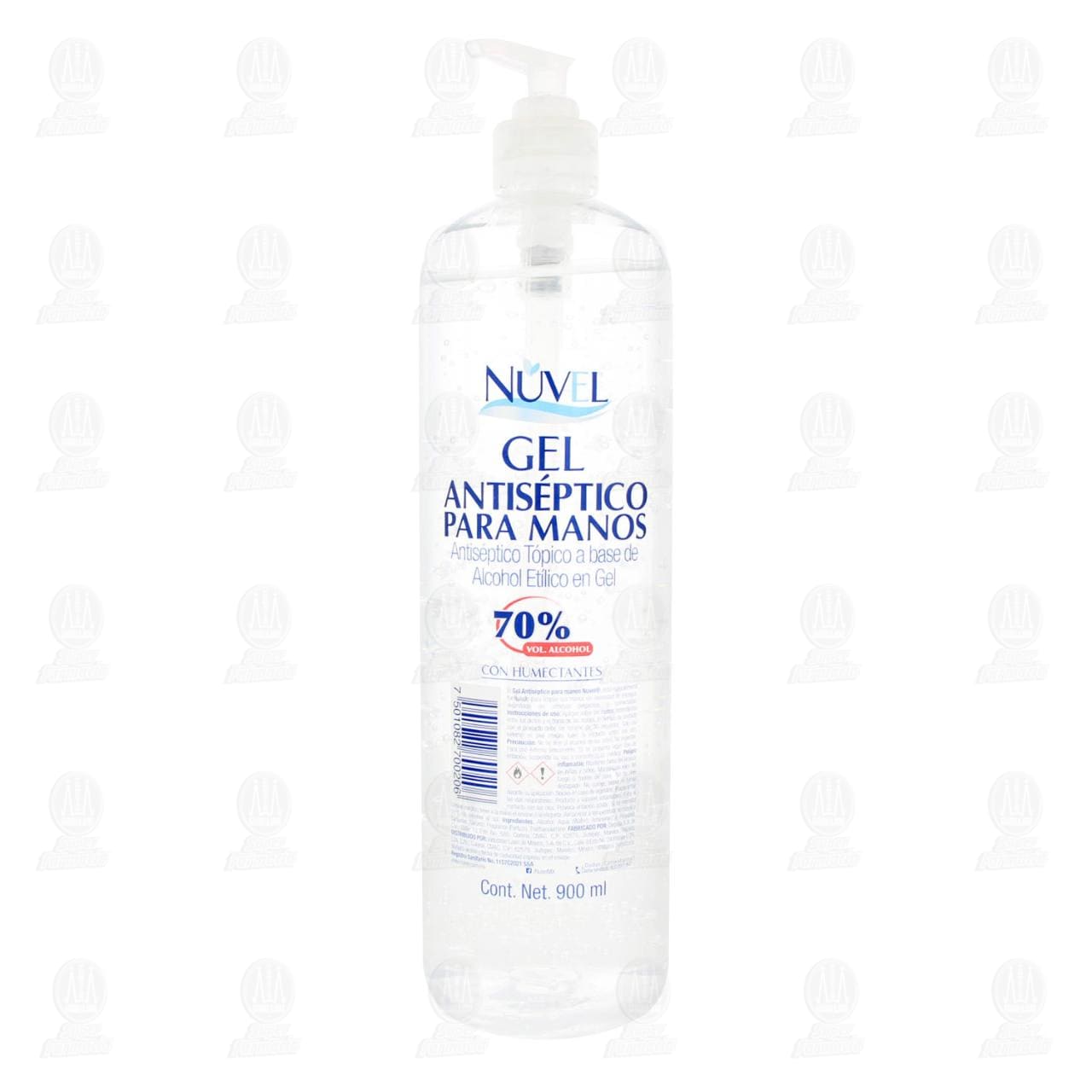 Gel antiséptico tópico Nuvel para manos, fórmula a base de alcohol etílico al 70%, diseñado para limpiar sus manos sin necesidad de enjuagar, dejándolas sin residuos pegajosos y humectadas. Envase con 900 mililitros.