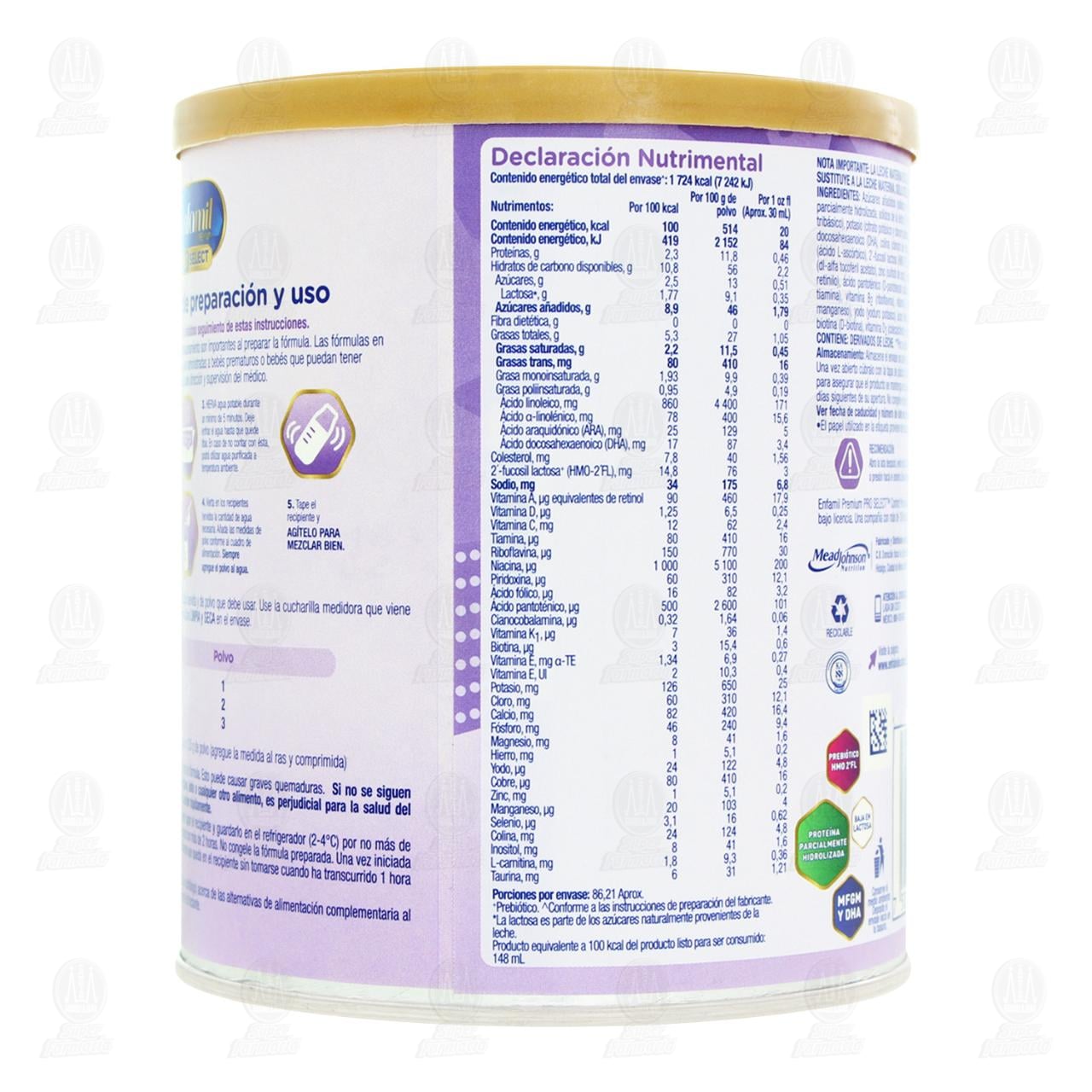 No use horno de microondas para calentar la fórmula. Esto puede causar graves quemaduras. Si no se siguen estrictamente las indicaciones de preparación e higiene, este o cualquier otro alimento, es perjudicial para la salud del niño. Una vez preparada la formula puede echarse a perder rápidamente. Usted puede alimentar a su bebé inmediatamente o puede tapar el recipiente y guardarlo en el refrigerador (2-4°C) por no más de 24 horas. No use la fórmula preparada si estuvo sin refrigerar por más de 2 horas. No congele la formula preparada. Una vez iniciada la alimentación, no refrigere el recipiente. Deseche el alimento que queda en el recipiente sin tomarse cuando haya transcurrido 1 hora desde que inició la alimentación del bebé. Consulte con su pediatra, profesional de la salud (médico o nutriólogo) acerca de las alternativas de alimentación complementaria al consumo de la fórmula infantil a partir de los 6 meses de edad del lactante. Nota importante: La leche materna es el mejor alimento para el bebé. Este producto no sustituye a la leche materna, sólo utilícelo bajo orientación médica. Almacene el envase sin abrir en un lugar fresco y seco (a temperatura no mayor a 30°C). Una vez abierto cúbralo con la tapa de plástico (incluida) y guárdelo bien cerrado en un lugar fresco y seco para asegurar que el producto se mantenga en buen estado. Utilice el contenido del envase dentro de los 30 días siguientes de su apertura. No congele el polvo, evite el almacenamiento prolongado y el calor excesivo. Recomendación: Abra la tapa despacio, evite dirigir el área de apertura hacia su cuerpo ya que el polvo puede salir a presión hacia el exterior. Éste es un fenómeno que no afecta la calidad nutricional del producto. Contiene: Derivados de leche.