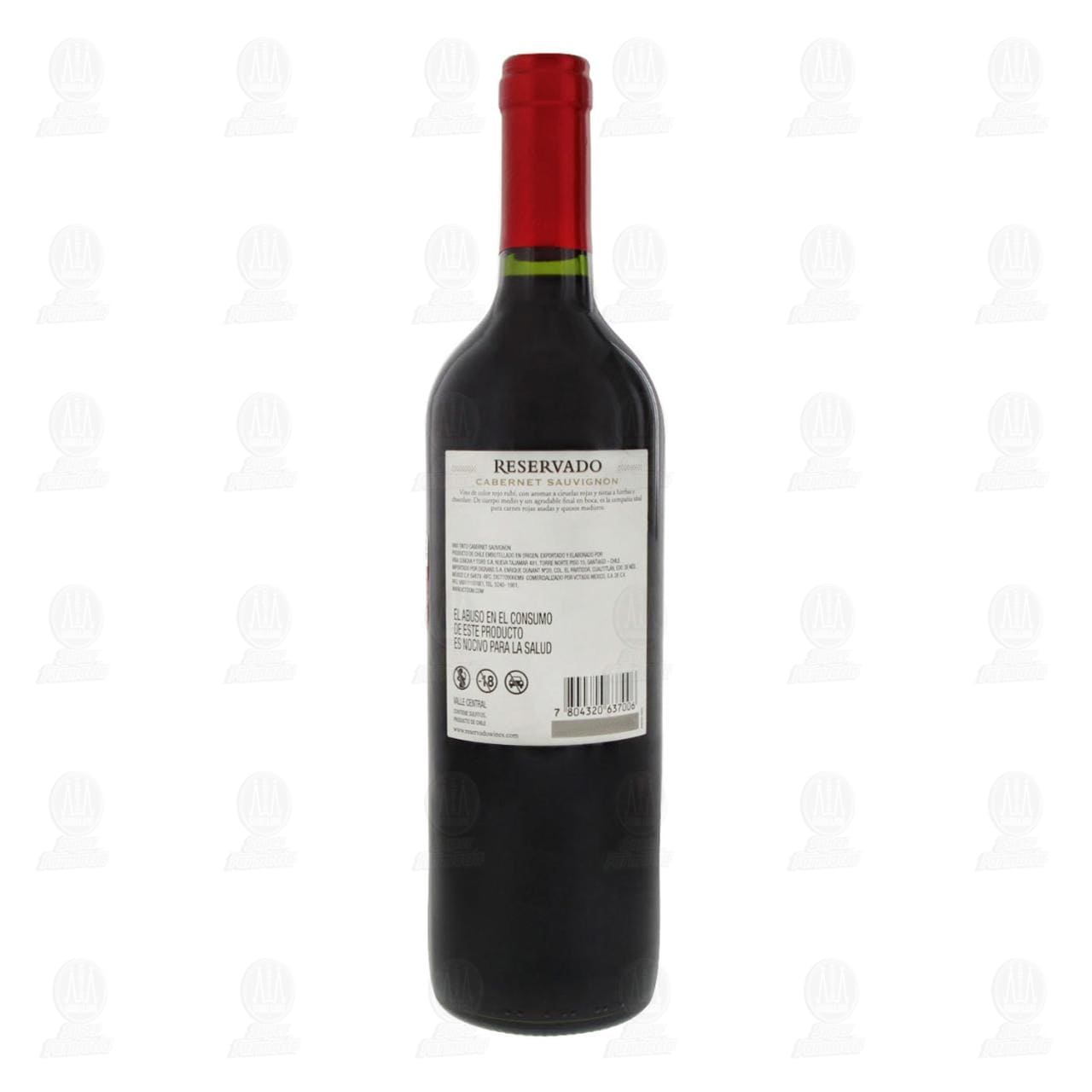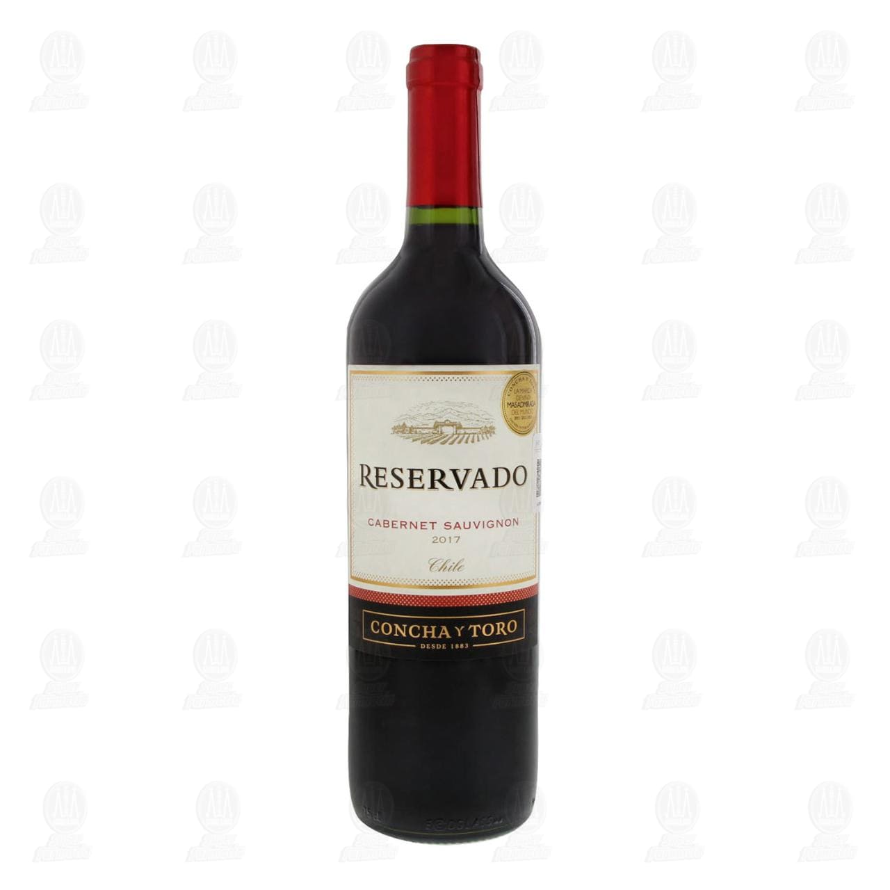 Vino tinto Reservado Cabernet Sauvignon Concha y Toro. Botella de 750 mililitros con 12% volumen de alcohol.