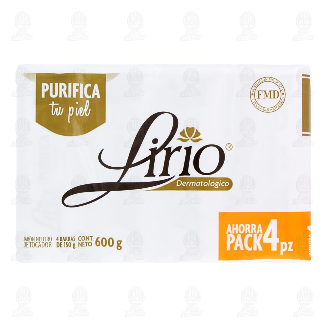 Pack jabón de tocador Lirio Dermatológico Purifica tu piel, Ahorra Pack. Contiene 4 barras de 150 gramos cada una.