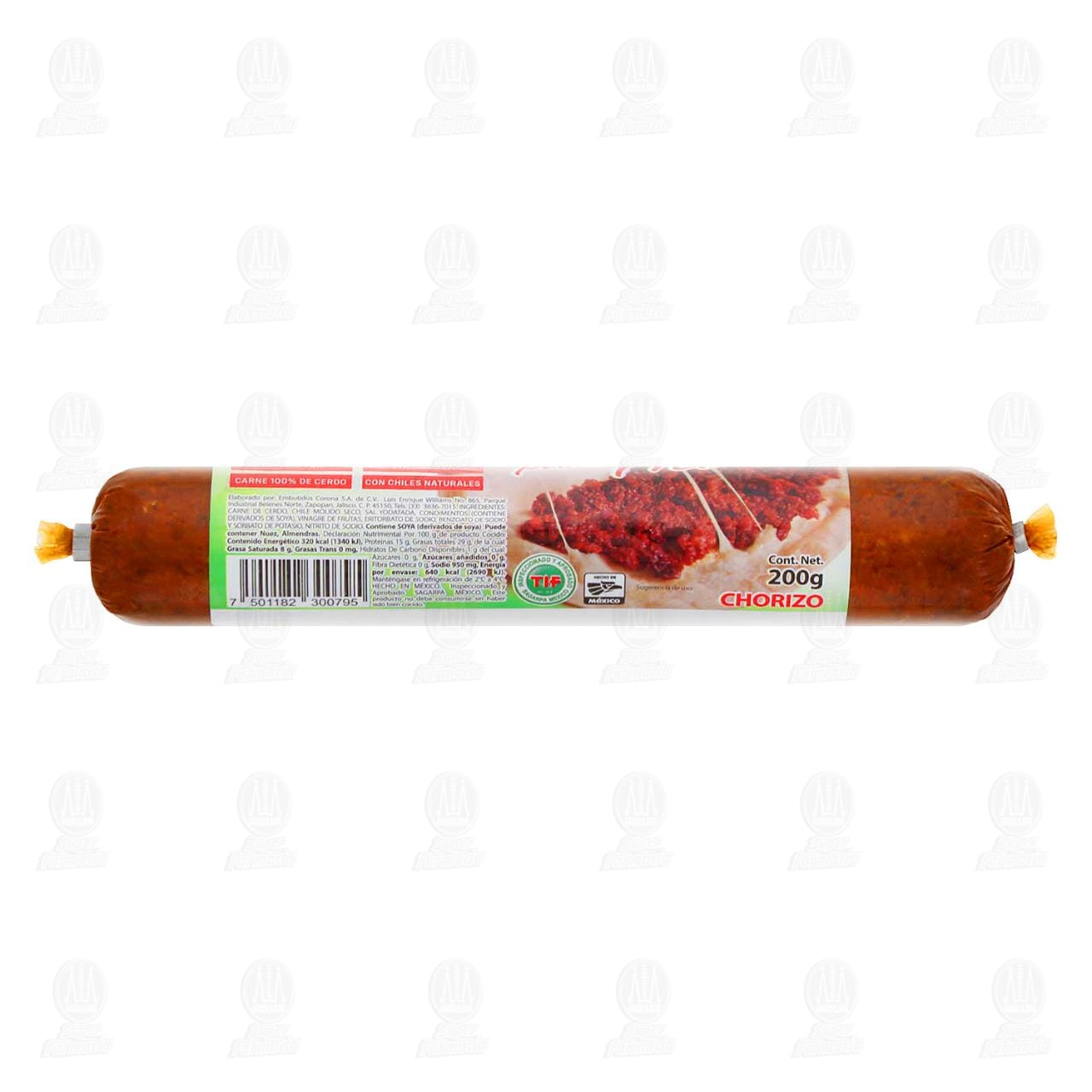 Chorizo Corona para freír, con chiles naturales y carne 100% de cerdo. Contiene 200 gramos.