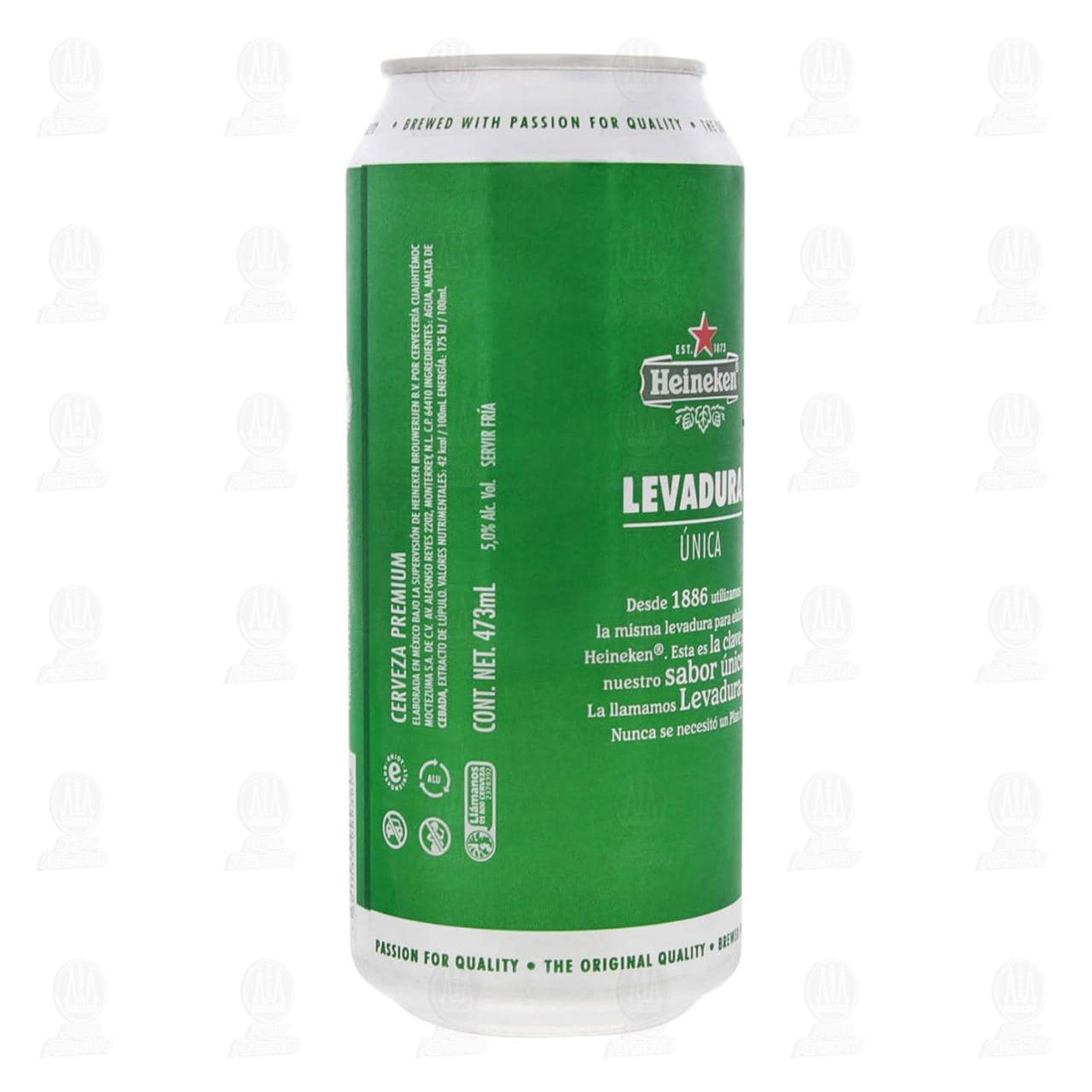Cerveza Heineken estilo lager, calidad premium. Lata de 473 mililitros con 5.0% volumen de alcohol.