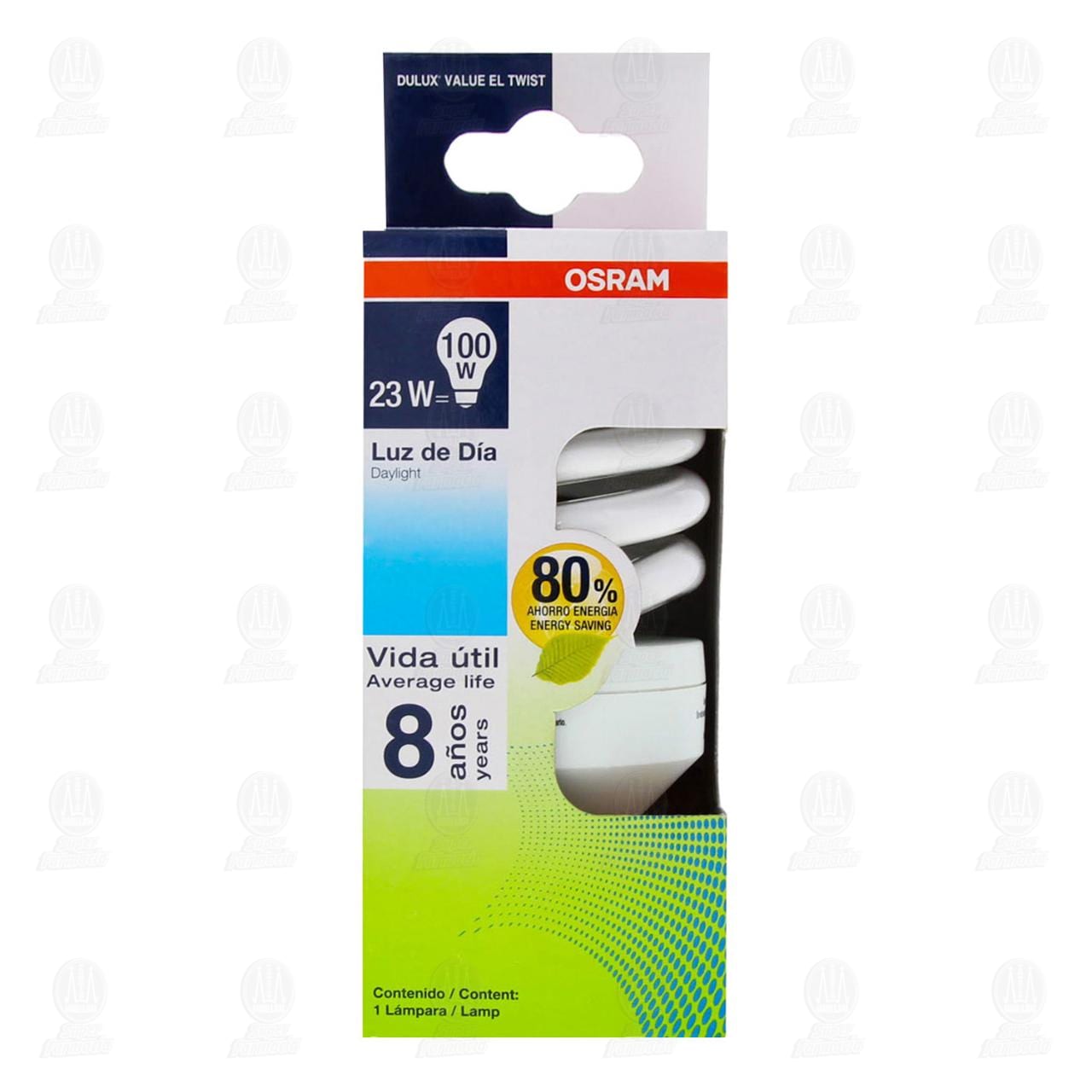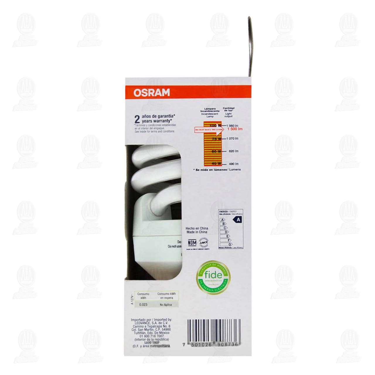 Foco ahorrador Osram de luz de día, fluorescente compacto autobalastrado, consumo de 23 watts equivalentes a 100 watts de iluminación. Contiene 1 pieza.