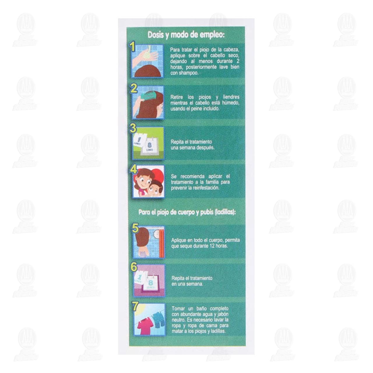 Dosis y modo de empleo: 1 para tratar el piojo de la cabeza, aplique sobre el cabello seco, dejando al menos durante 2 horas, posteriormente lave bien con shampoo. 2 retire los piojos y liendres mientras el cabello está húmedo usando el peine incluido. 3 repita el tratamiento una semana después. 4 se recomienda aplicar el tratamiento a la familiar para prevenir la reinfestación. Para el piojo de cuerpo y pubis (ladillas): 5 aplique en todo el cuerpo, permita que seque durante 12 horas. 6 repita el tratamiento en una semana. 7 tomar un baño completo con abundante agua y jabón neutro. Es necesario lavar ropa y ropa de cama para matar a los piojos y ladillas. Vehículo indicación terapéutica: mata y elimina piojos, liendres y ladillas. de la cabeza, vello corporal y vello púbico.