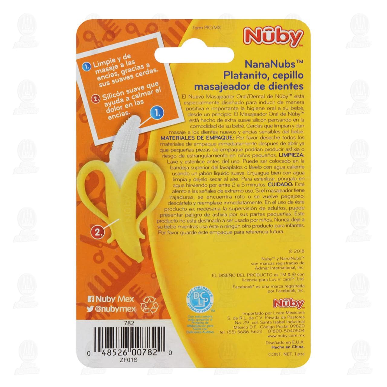 Mordedera Nuby NanaNubs platanito indicada para niños de 3 meses en adelante, cepillo masajeador de dientes hecho de extra suave silicón, con cerdas que limpian y dan masaje a los dientes nuevos y encías sensibles del bebé. Contiene 1 pieza.