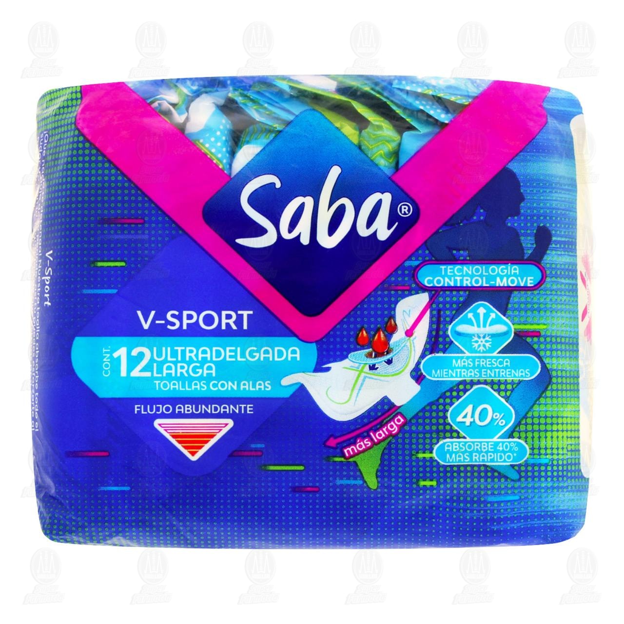 Toallas Femeninas Saba V-Sport Ultradelgada con Alas para Flujo Superabundante, super suave y absorbe 40% más rápido para mantenerte fresca y cómoda mientras entrenas. Paquete con 12 piezas.