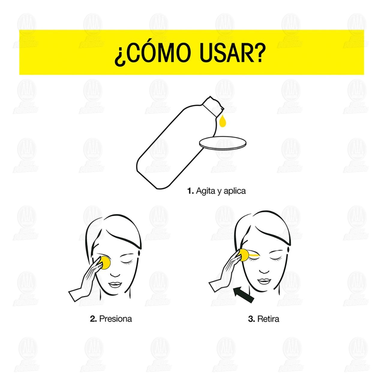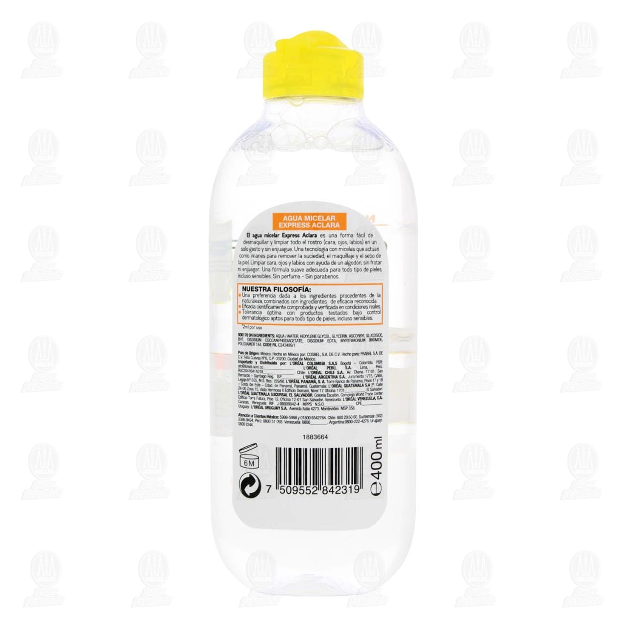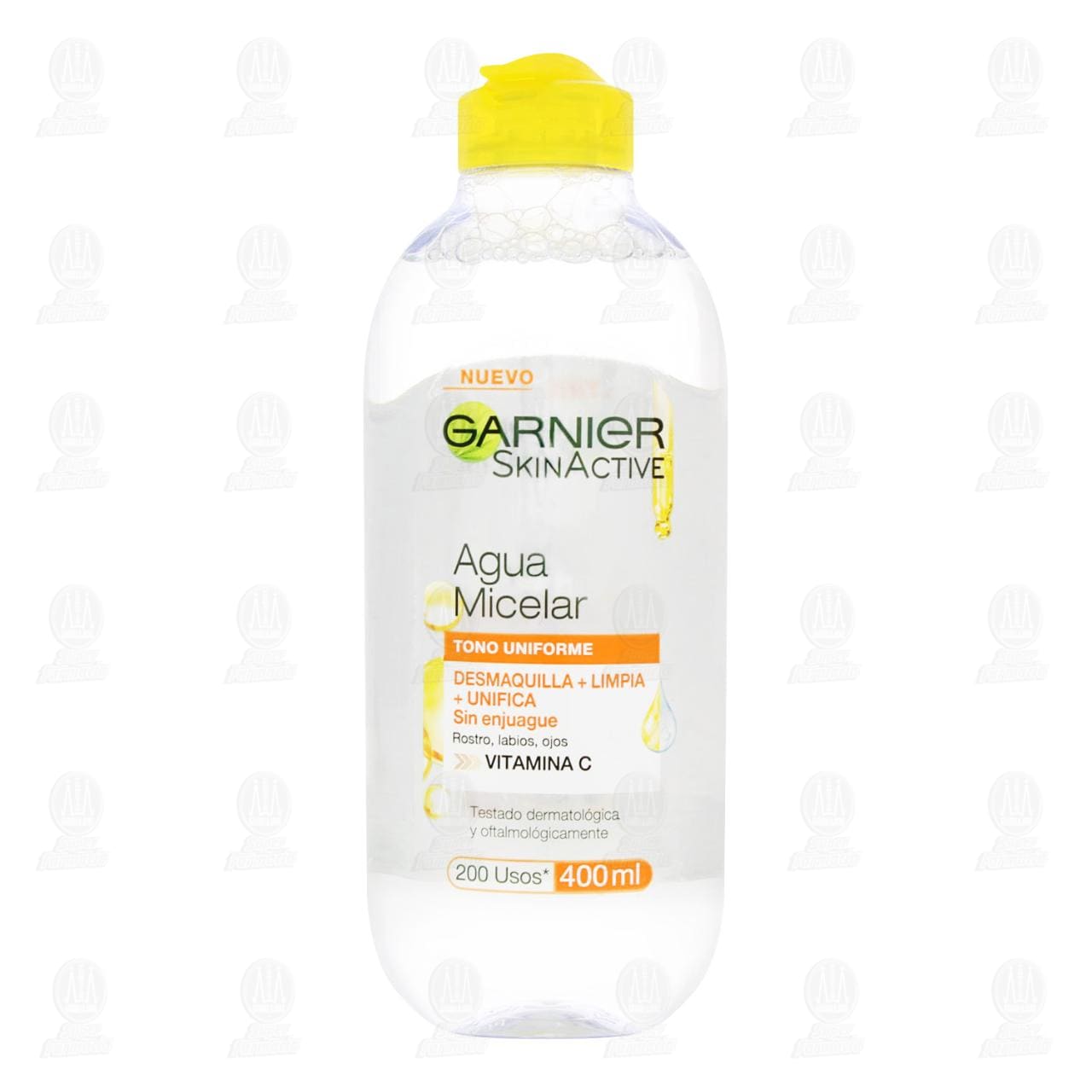 Agua Micelar Garnier SkinActive Express Aclara. Desmaquilla, limpia y unifica el rostro, labios y ojos, testado dermatológica y oftalmológicamente, tono uniforme, sin enjuague, con vitamina C. Envase con 400 mililitros.