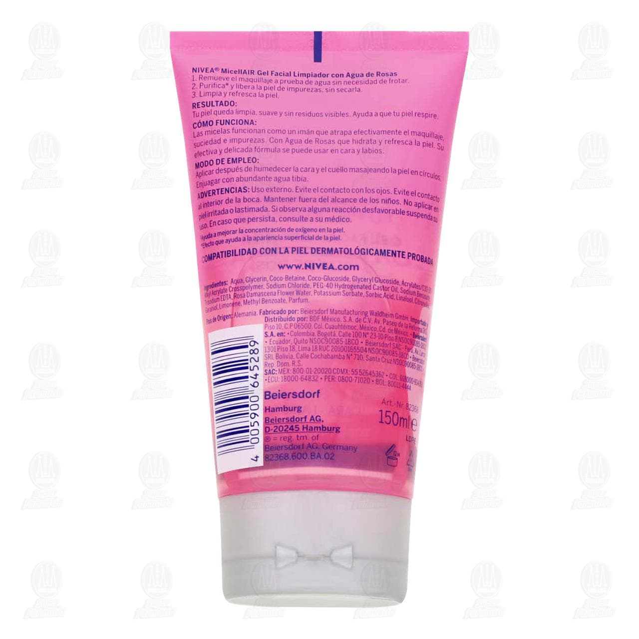 Gel facial limpiador Nivea MicellAIR con agua de rosas, remueve el maquillaje a prueba de agua sin necesidad de frotar, limpia, refresca, purifica y libera la piel de impurezas, para todo tipo de piel. Envase con 150 mililitros.