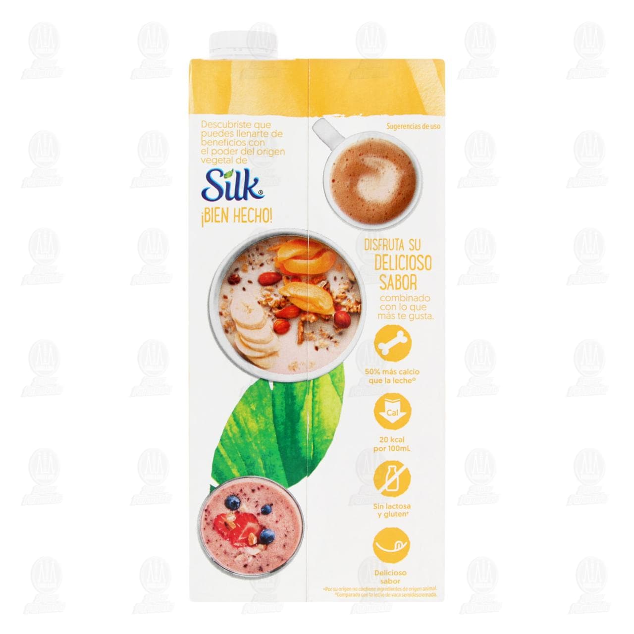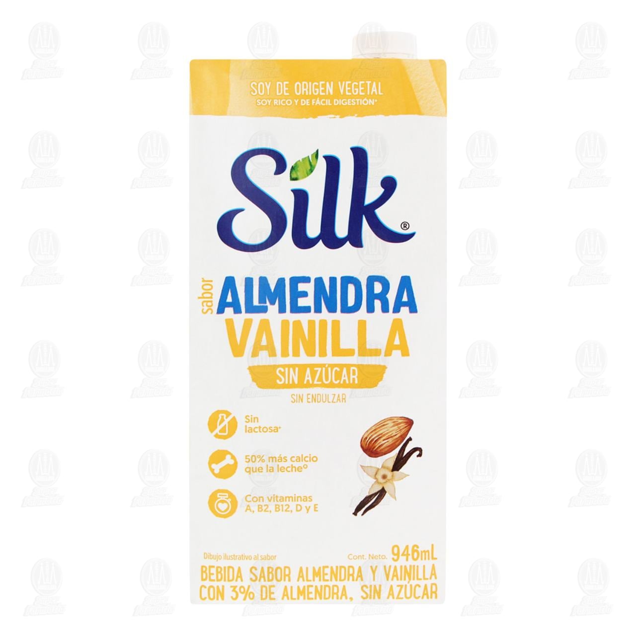 Alimento líquido Silk de almendra, sabor vainilla, sin azúcar y sin endulzar, con 50% más calcio. Envase con 946 mililitros.