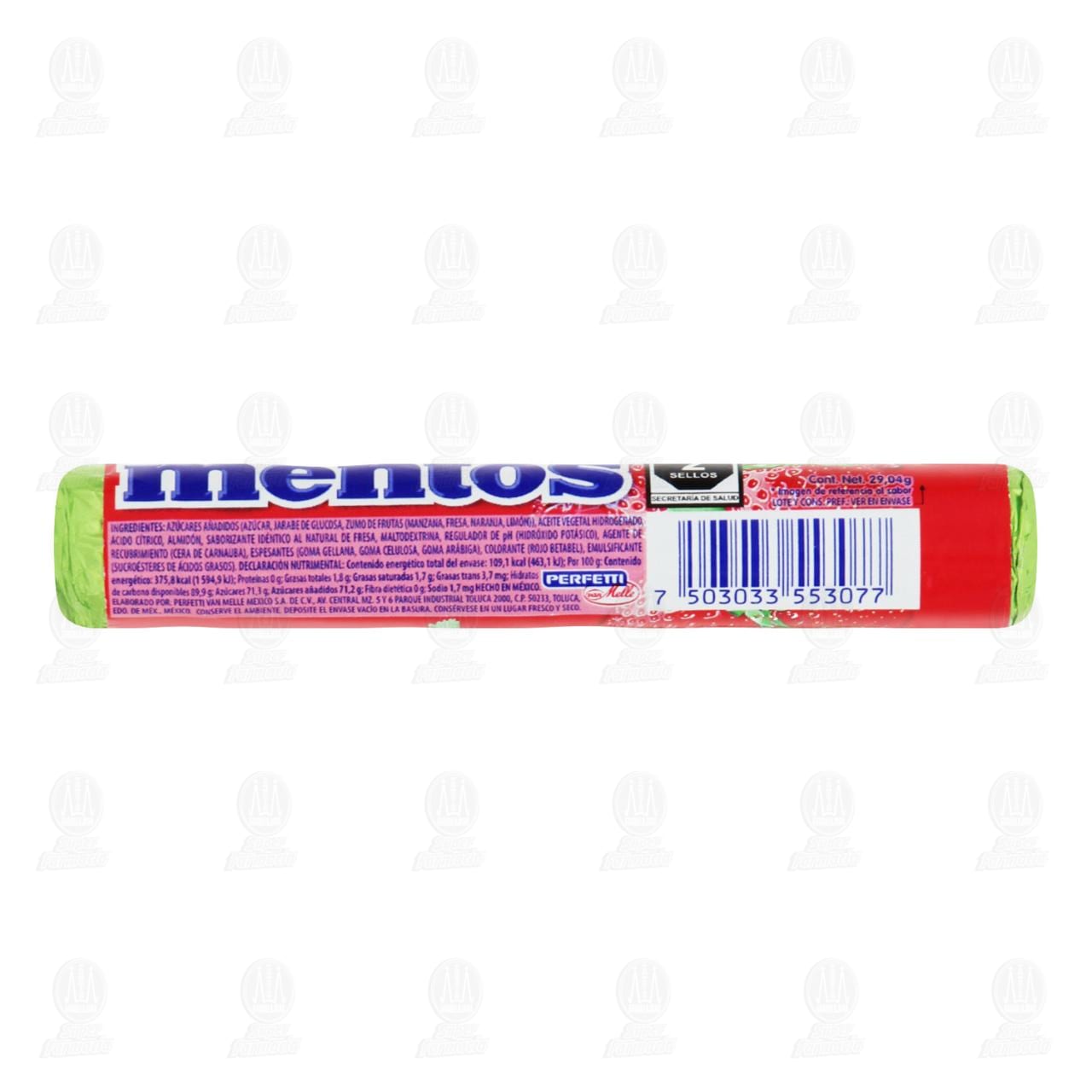 Caramelos Mentos Masticables confitados sabor a fresa. Contiene 29.04 gramos.