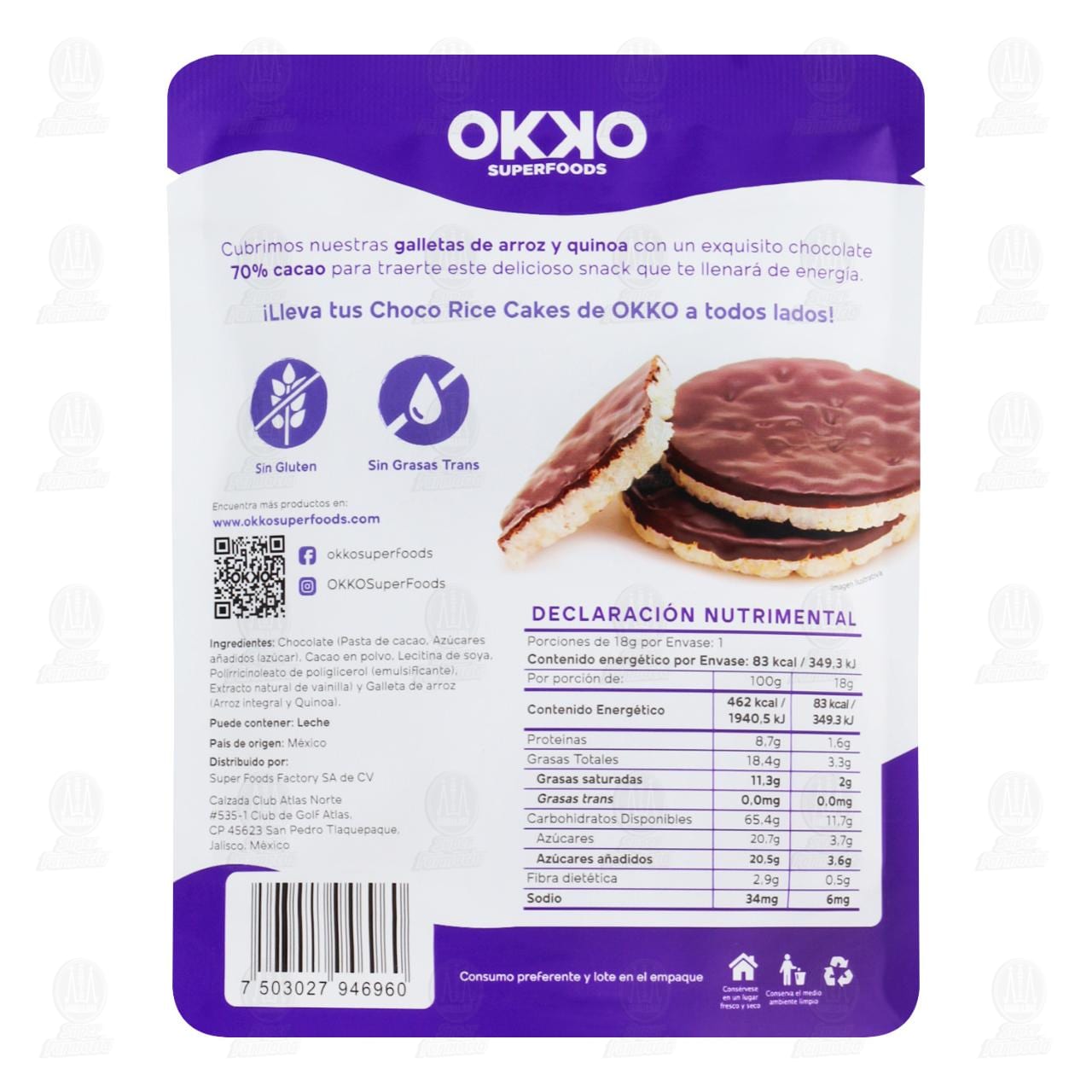 Galleta de arroz y quinoa Okko Super Foods Rice Cakes cubierta de Chocolate 70% cacao, un delicioso snack que te llenara de energía. Paquete de 18 gramos con 1 pieza.