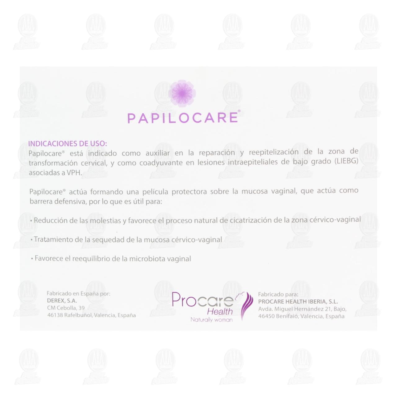 Papilocare está indicado como auxiliar en la reparación y reepitelización de la zona de transformación cervical, y como coadyuvante en lesiones intraepiteliales de bajo grado (LIEBG) asociadas a VPH. Papilocare actúa formando una película protectora sobre la mucosa vaginal, que actúa como barrera defensiva, por lo que es útil para: reducción de las molestias y favorece el proceso natural de cicatrización de la zona cérvico-vaginal. Tratamiento de la sequedad de la mucosa cérvico-vaginal. Léase instructivo anexo.