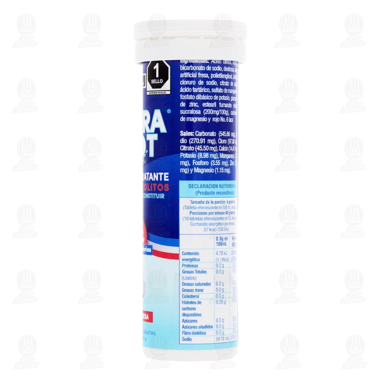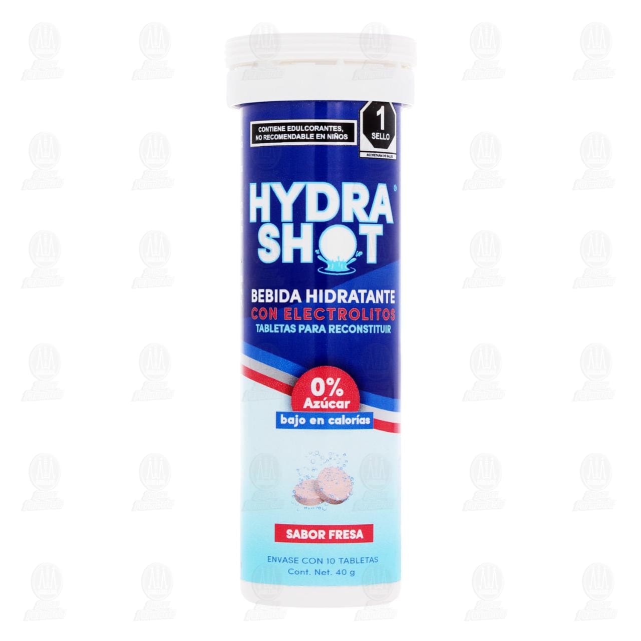 Tabletas para reconstituir Bebida Hidratante Hydra Shot con electrolitos 0% azúcar sabor fresa. Envase con 10 tabletas de 42 gramos.