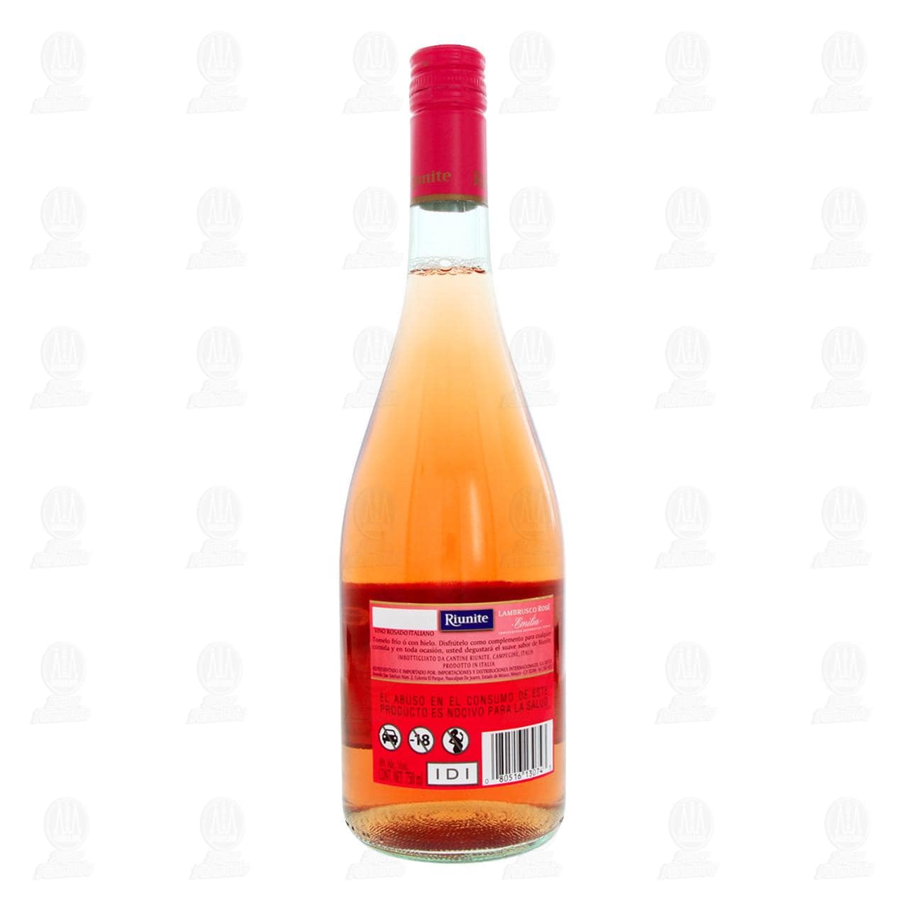 Vino Rosado Italiano Riunite Lambrusco Rosé. Botella con 750 mililitros con 8% Volumen de alcohol.