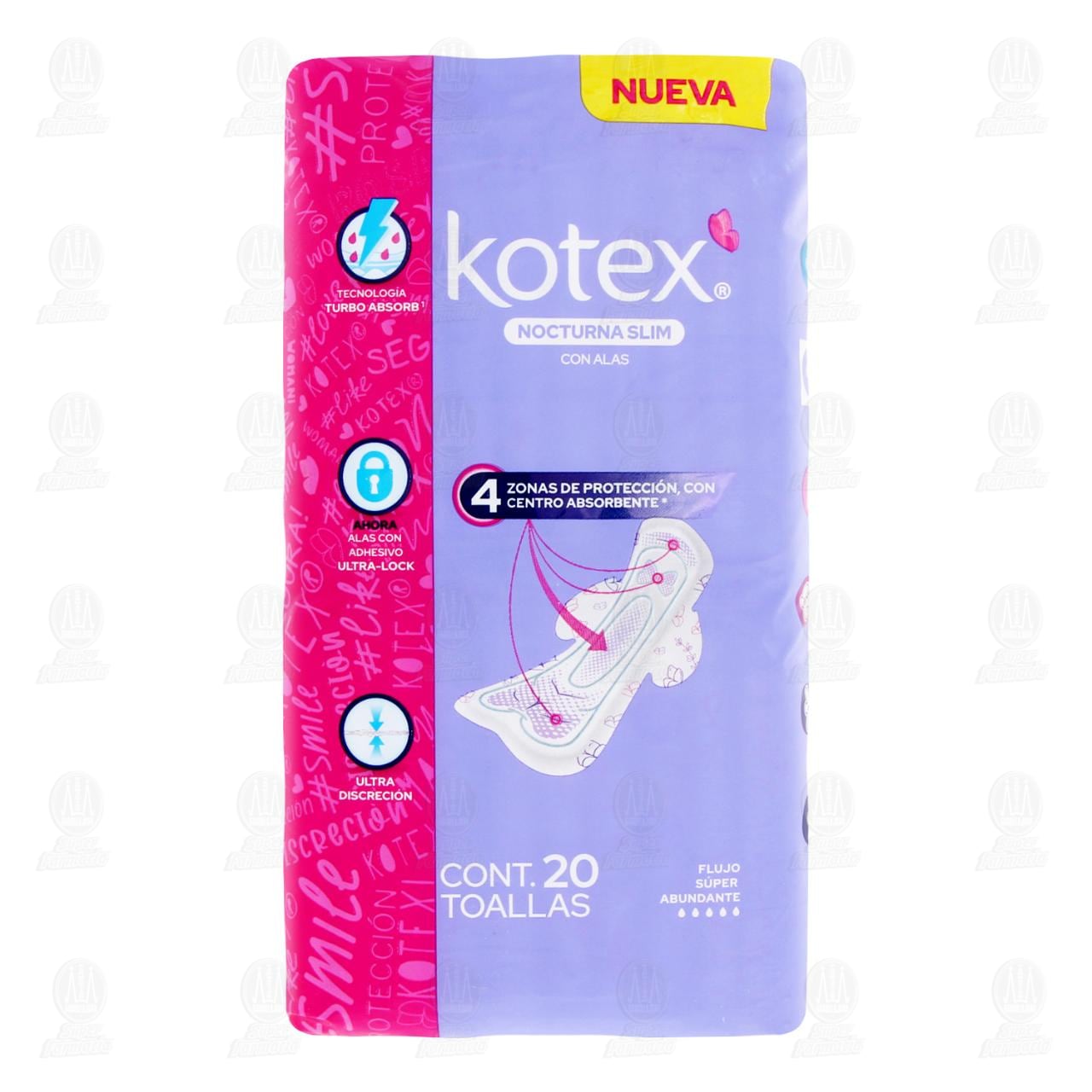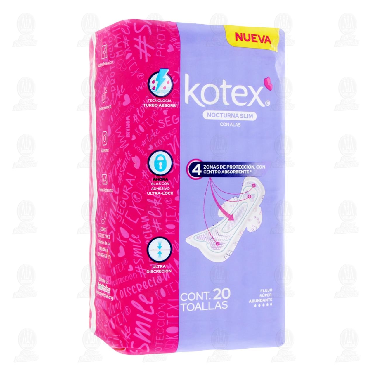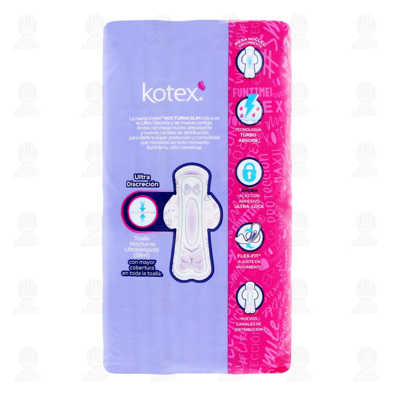 Toallas Femeninas Kotex Nocturna Slim con Alas es Ultra Discreta y se Mueve Contigo Ahora con Mega Núcleo Absorbente. Paquete con 20 piezas.