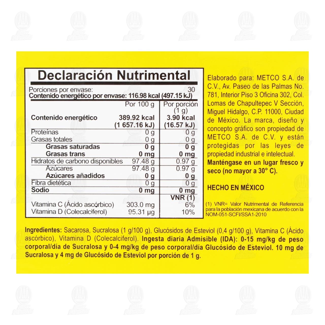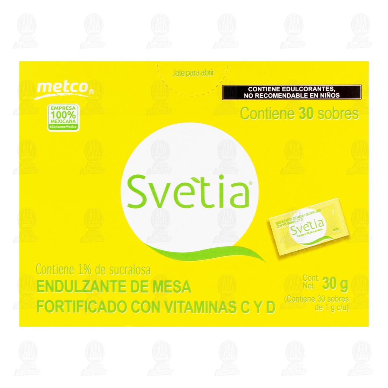 Endulzante de Mesa Svetia fortificado con vitaminas C y D. Contiene 30 sobres de 1 gramo cada uno.