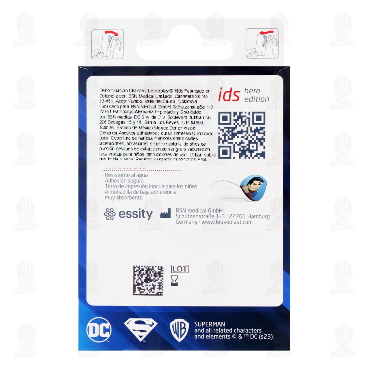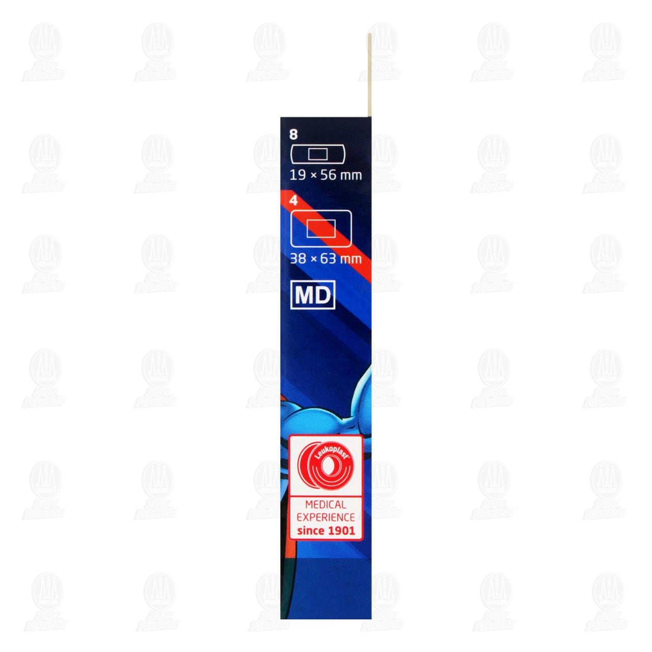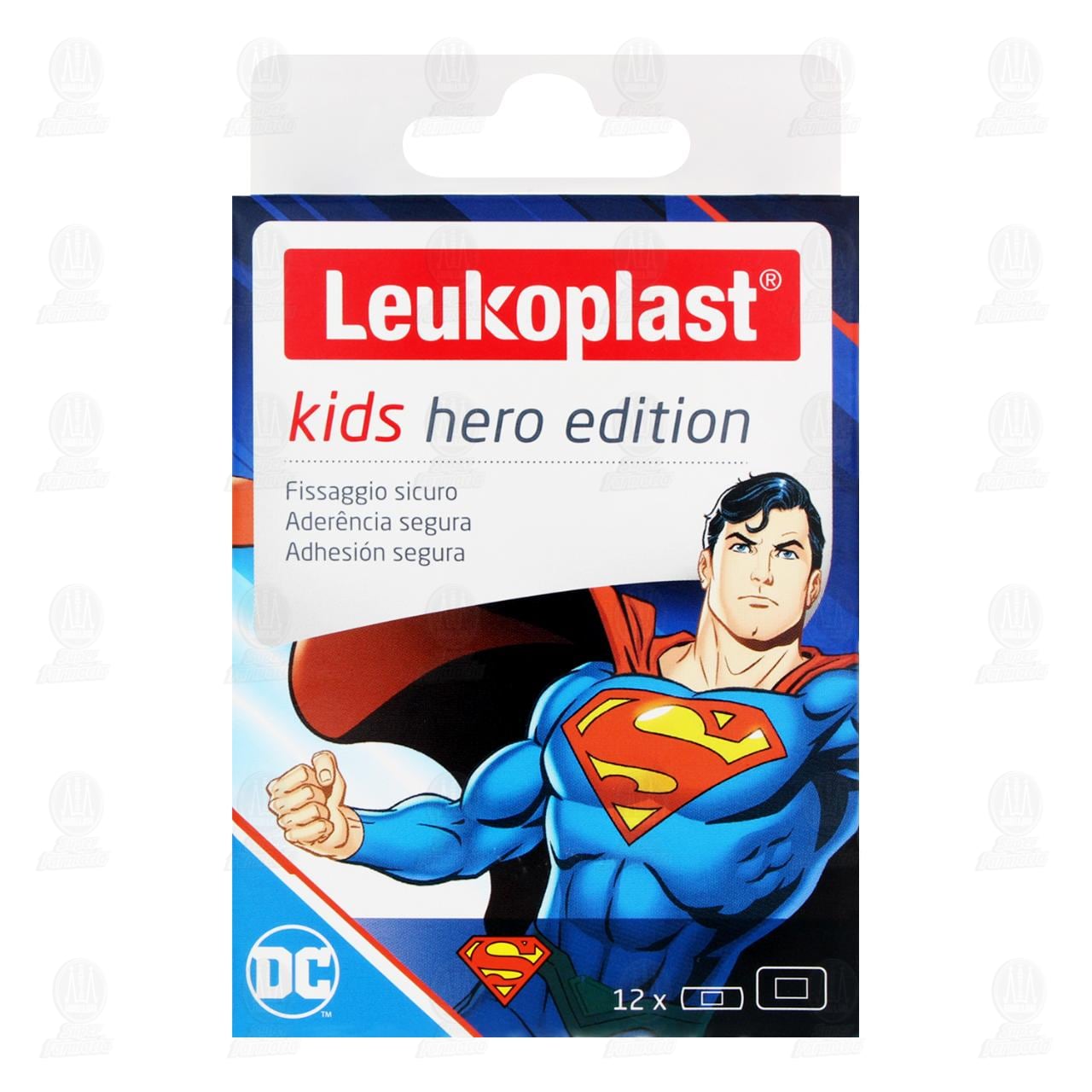 Curas Leukoplast kids hero edition. Contiene 12 piezas (8 piezas de 19 x 56 mm y 4 piezas de 38 x 63 mm).