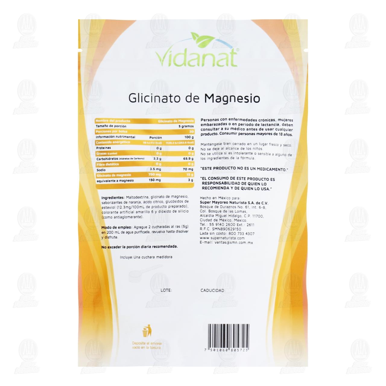 Suplemento Alimenticio Vidanat Glicinato de Magnesio, Polvo para reconstituir bebida sabor naranja. Bolsa con 150 gramos.