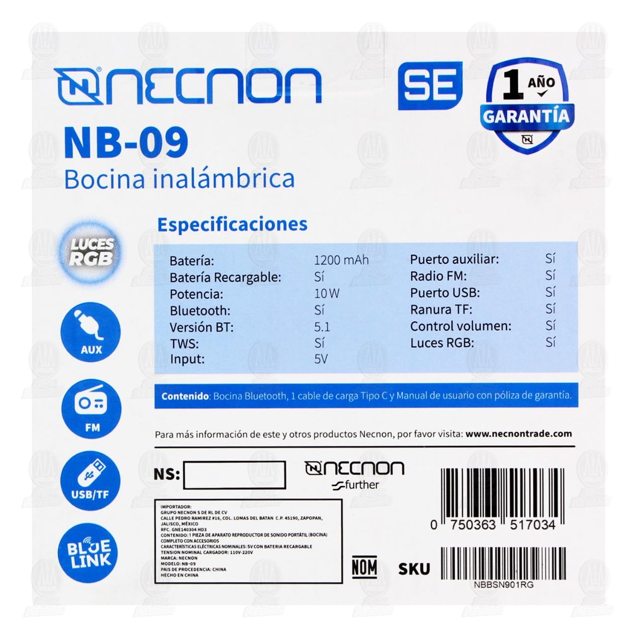 Bocina Bluetooth Necnon Inalámbrica Further NB-09. Contiene 1 pieza.
