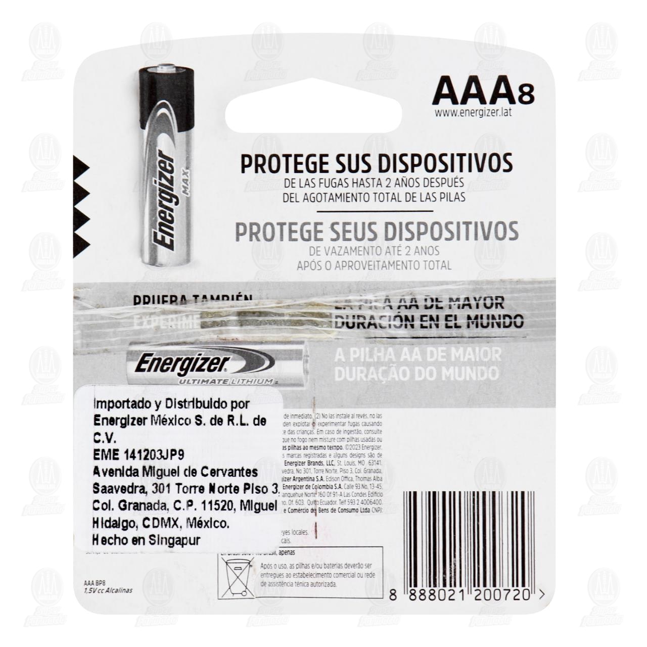 Pilas Energizer Max Alcalinas AAA de 1.5V, Protege sus dispositivos de las fugas hasta 2 años después del agotamiento total de las pilas. Contiene 8 piezas.