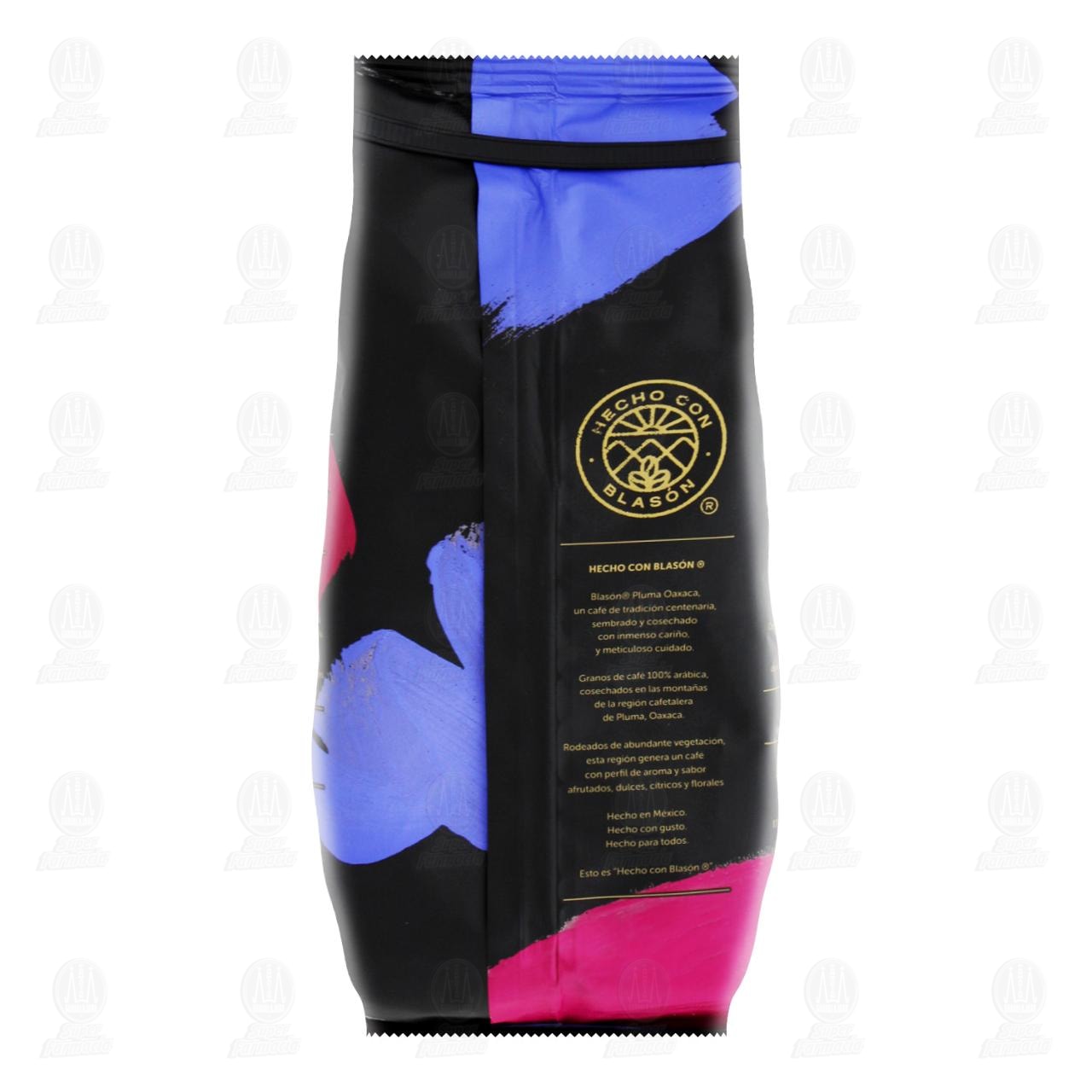 Café Blasón Pluma Oaxaca 100% arábica, tostado y molido, con perfil de sabor y aroma afrutados, dulces, cítricos y florales. Contiene 340 gramos.