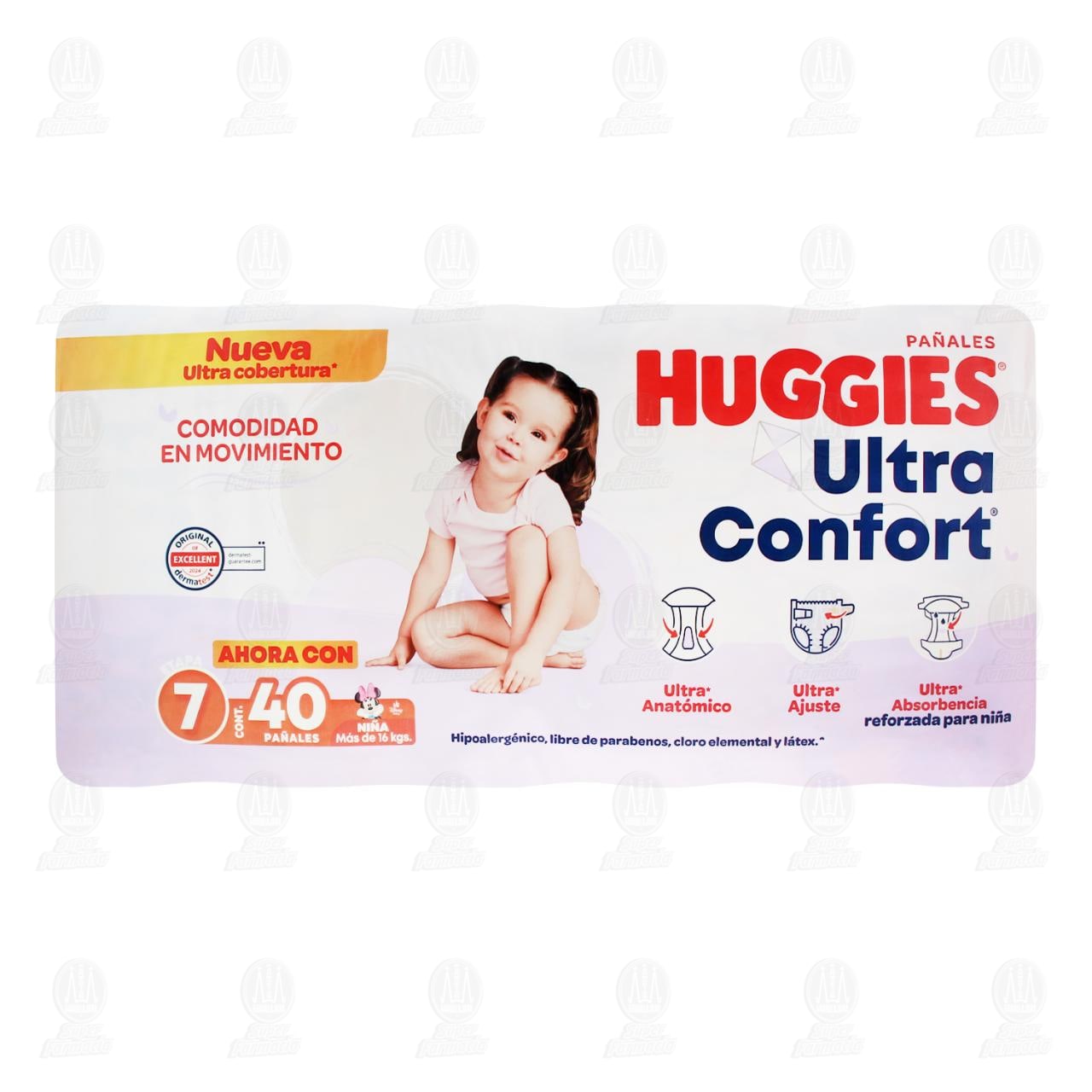 Pañales Huggies Ultra Confort Etapa 7 para niña de más de 16 kilogramos, Con diseño anatómico y ultra absorbencia reforzada al centro para niña, Comodidad en movimiento. Paquete con 40 pañales.