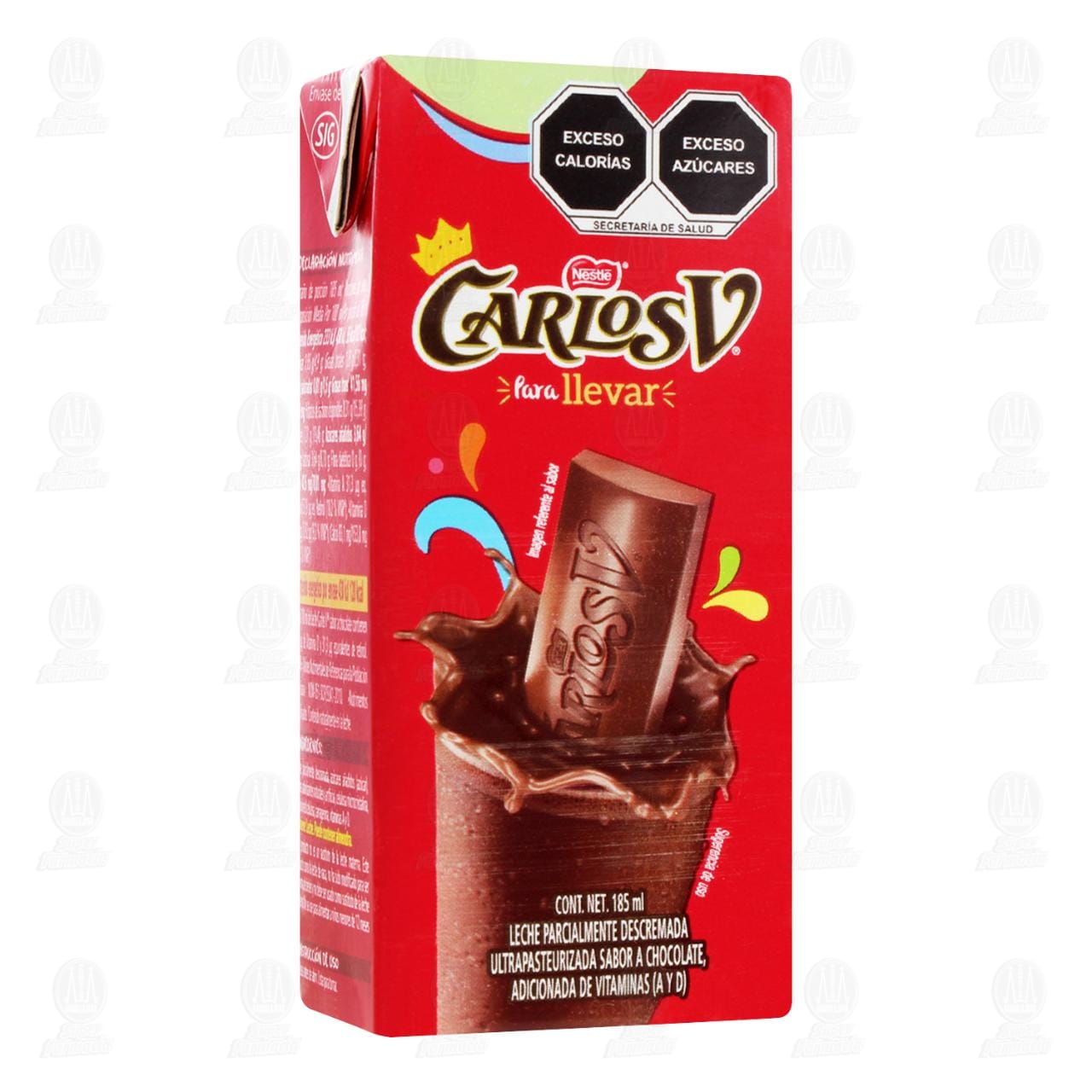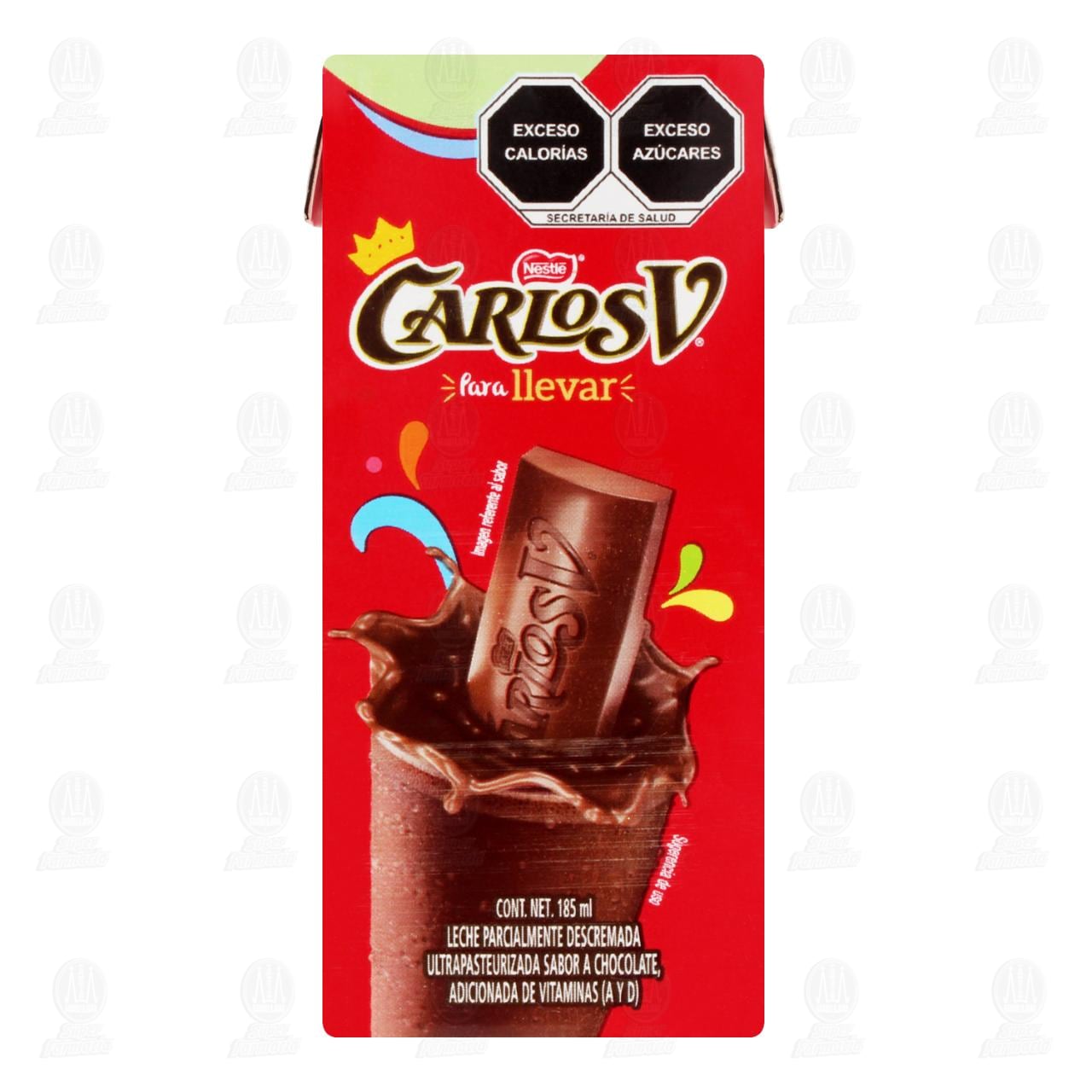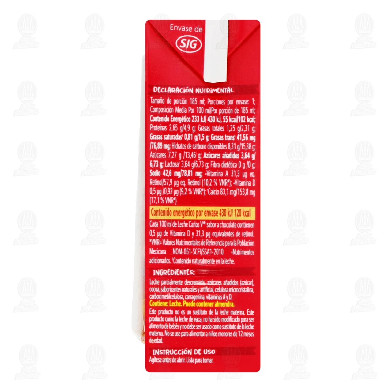 Leche para llevar Carlos V parcialmente descremada ultrapasteurizada sabor a chocolate, adicionada de vitaminas A y D. Contiene 185 mililitros.