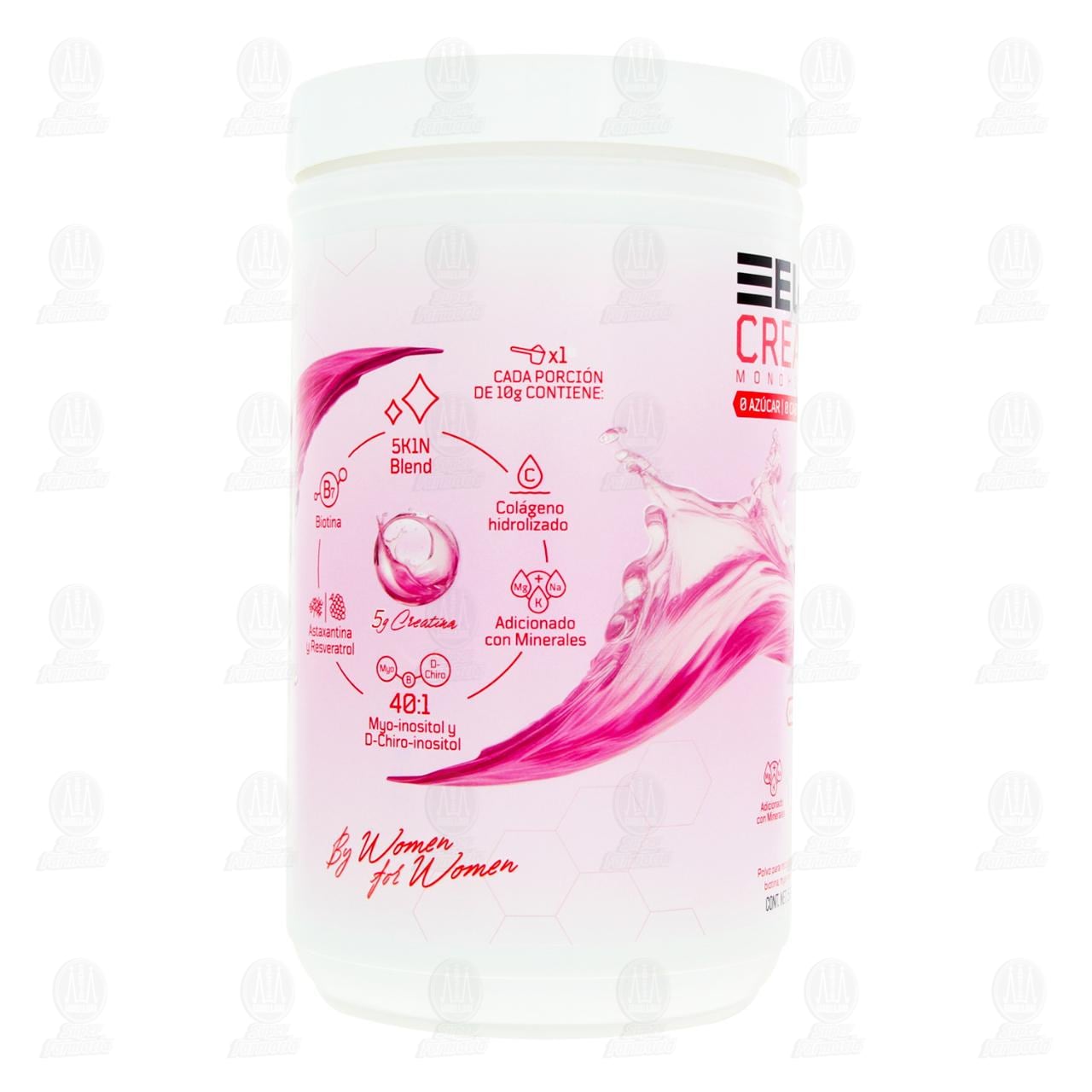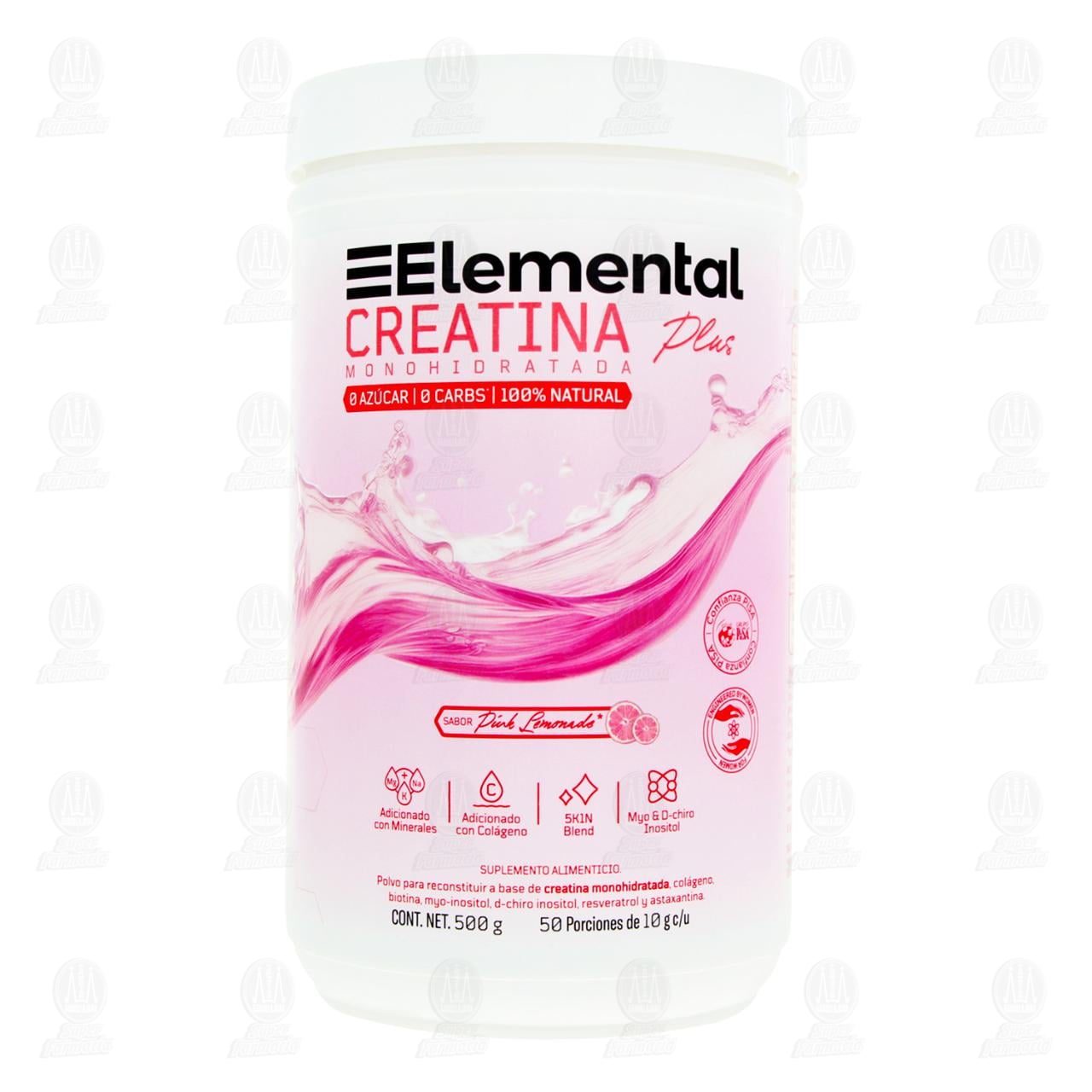 Creatina Monohidratada Elemental Plus Sabor Pink Lemonade, suplemento alimenticio 100% natural, sin azúcar ni carbohidratos, con colágeno, minerales e inositol. Contiene 500 gramos.