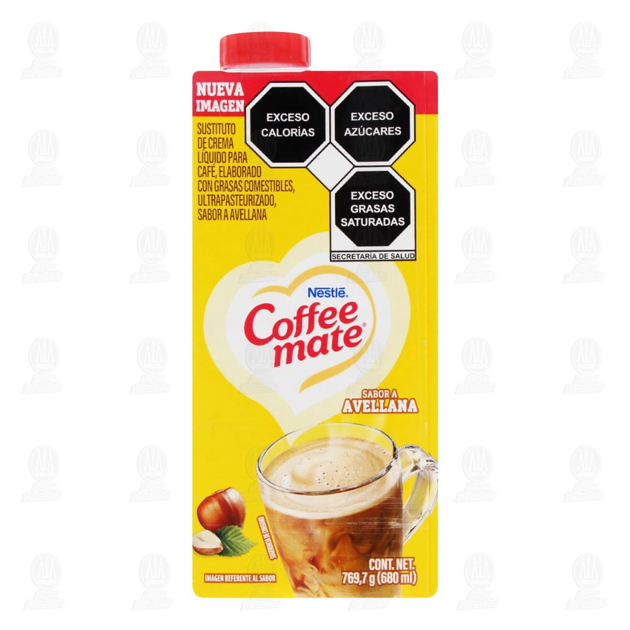 Sustituto de crema para Café Coffee Mate líquido sabor a avellana, ideal para café, elaborado con grasas comestibles, ultrapasteurizado. Contiene 680 mililitros.
