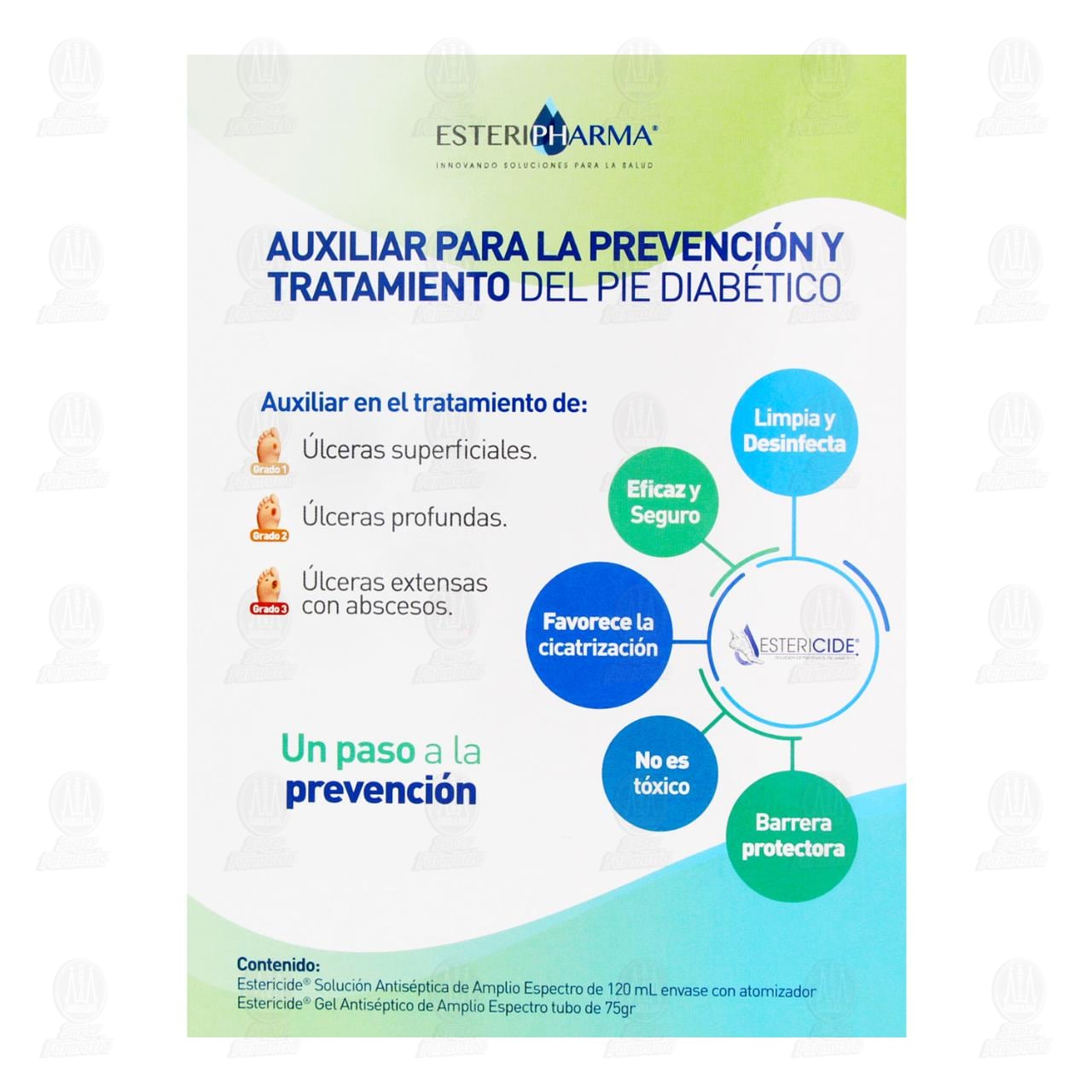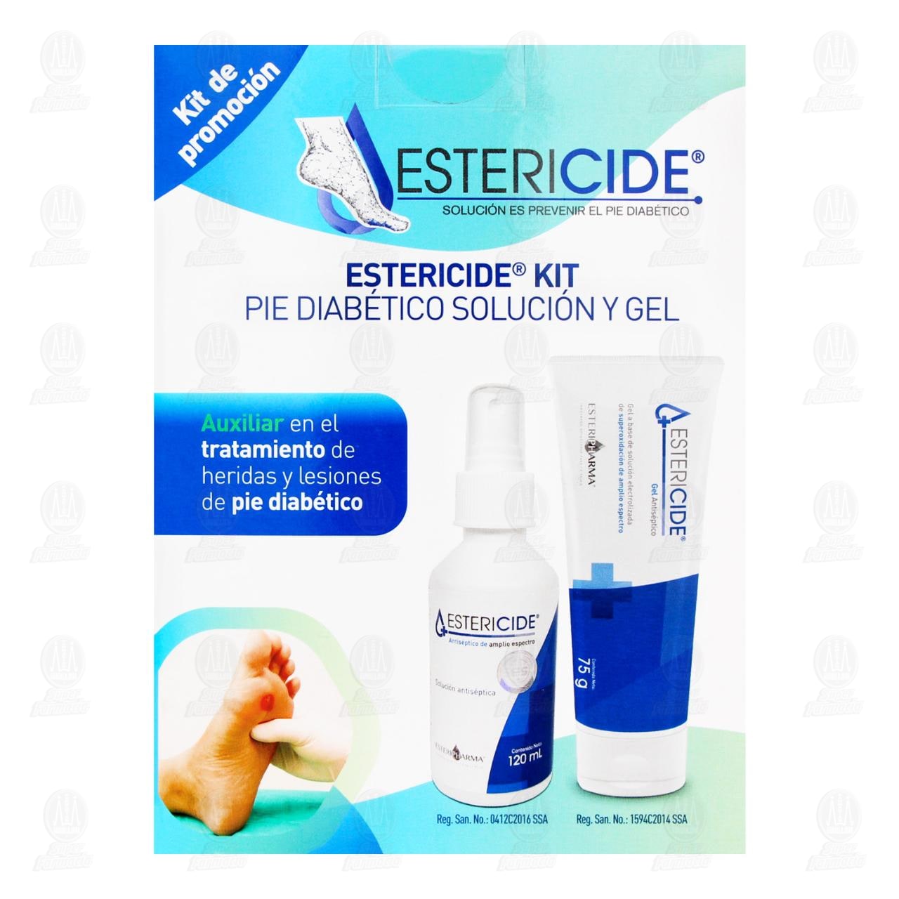 Kit Estericide Pie Diabético. Contiene 2 piezas: 1 solución antiséptica de amplio espectro estericide de 120 mililitros con atomizador y 1 gel antiséptico de amplio espectro estericide de 75 gramos.