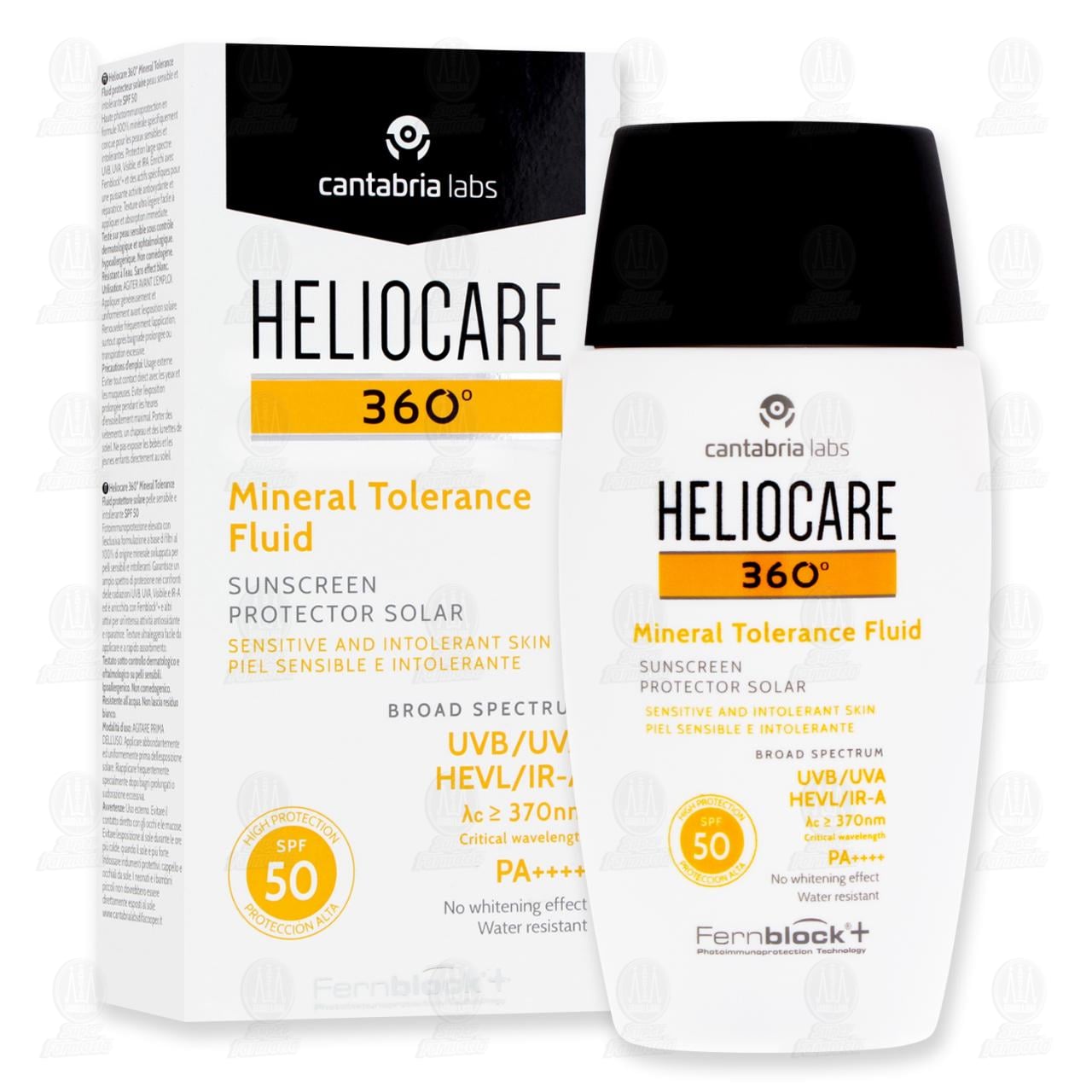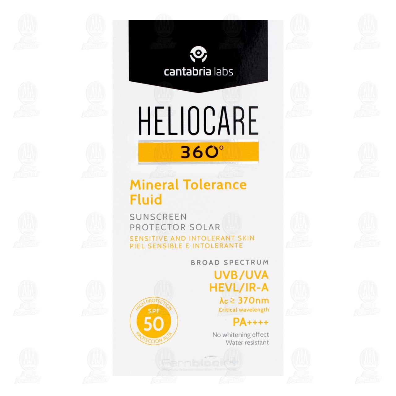 Heliocare 360° Mineral Tolerance Fluid protector solar con SPF 50 desarrollado para piel sensible e intolerante, Fórmula 100% mineral, ultraligera, resistente al agua y de rápida absorción. Contiene 50 mililitros.