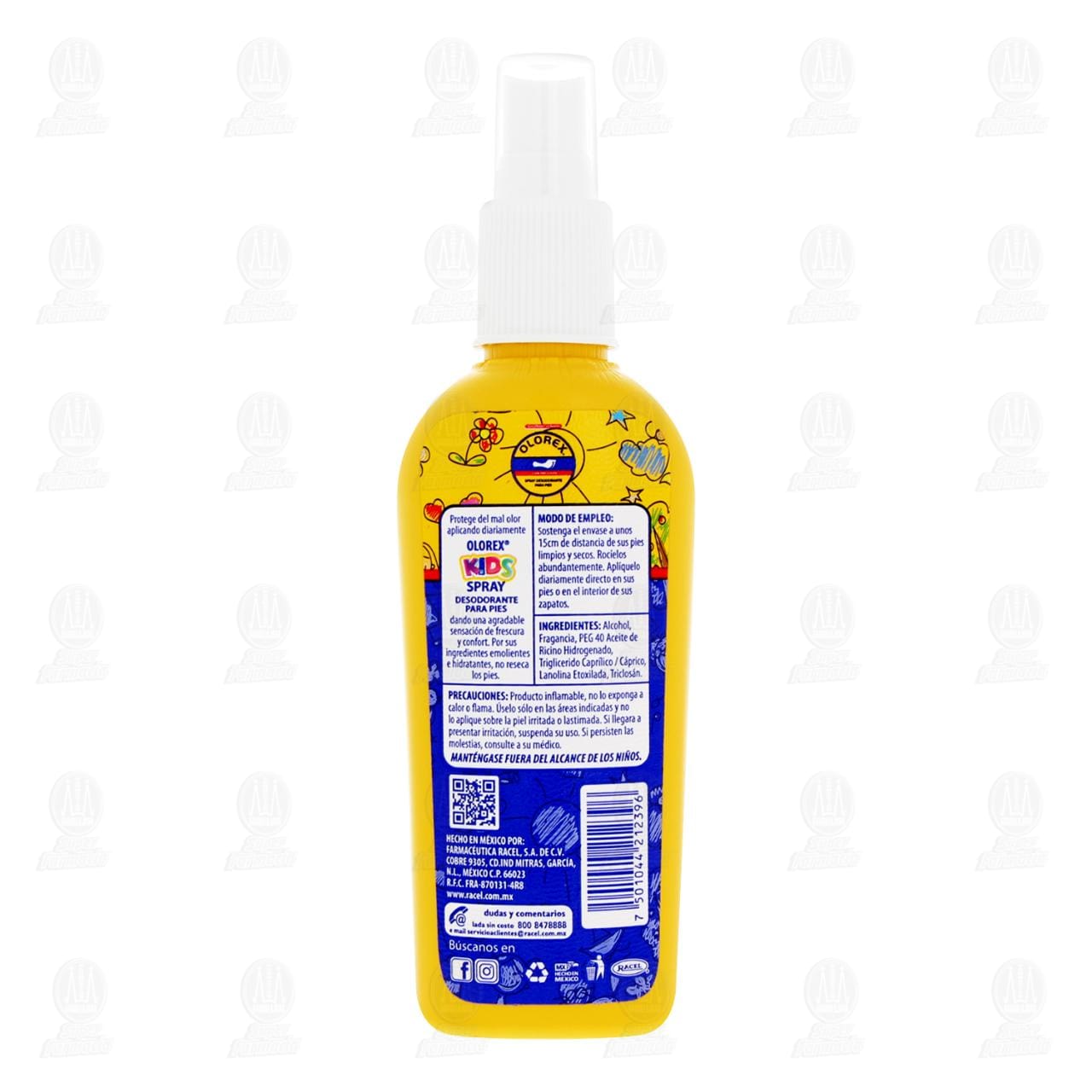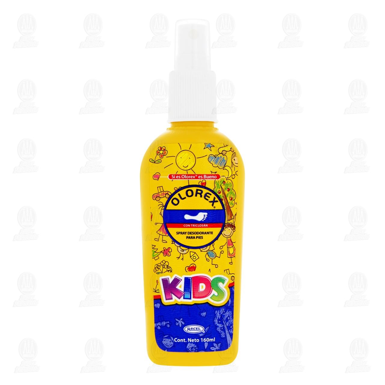 Spray Desodorante Olorex Kids con triclosán para pies, protege contra el mal olor y brinda sensación de frescura por sus ingredientes emolientes e hidratantes. Contiene 160 mililitros.
