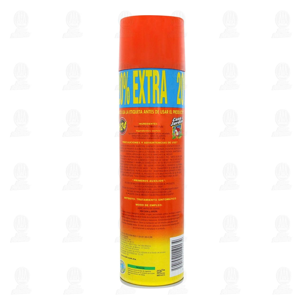 No se deje al alcance de los niños. Puede ser nocivo en caso de ingestión. Puede ser nocivo por el contacto con la piel. Puede ser nocivo si se inhala. En caso de inhalación, ingestión, contacto dérmico o contacto ocular accidental, que presente alguna alteración pulmonar, digestiva, nerviosa y/o alérgica, se recomienda alejar a la persona del área tratada, mantenerla cómoda, abrigada y acudir de inmediato al médico. Evítese la inhalación prolongada y contacto con los ojos y piel. Antes de aplicar este producto, proteja los alimentos y enseres de cocina. No se aplique en presencia de personas y animales domésticos. No se reutilice este envase. Evítese el contacto con los ojos. No queme o perfore el envase ni lo exponga al calor o flama, aún después de vacío. No se transporte ni almacene junto a productos alimenticios, ropa o juguetes. Mantenga bien cerrado el envase fuera del alcance de los niños. El producto está bajo presión. No se aplique cerca de los ojos. Siga correctamente las instrucciones de uso. Primeros auxilios: en caso de malestar por exposición aguda al producto, aleje a la persona del área. En caso de contacto con ojos o piel, lávese con abundante agua. En caso de malestar por sobre exposición lleve al paciente con el médico y muéstrele esta etiqueta. Antídoto: tratamiento sintomático. En caso de existir defectos de fabricación industrias H24 se compromete a reemplazar el producto.