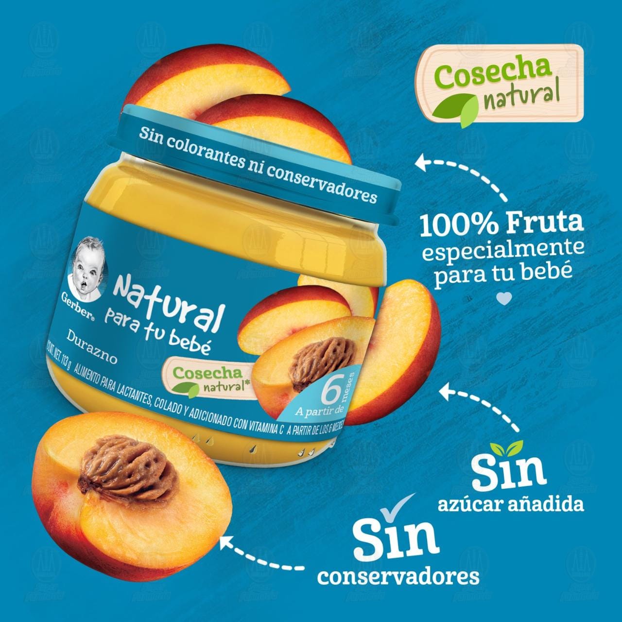 Papilla Gerber Cosecha Natural Etapa 2 Durazno, alimento para bebé de 6 meses en adelante. Cuida la salud de tu bebé con las papillas infantiles Gerber Etapa 2, alimento infantil fortificado con vitamina C y hierro. Frasco con 113 gramos.