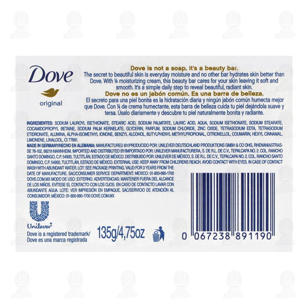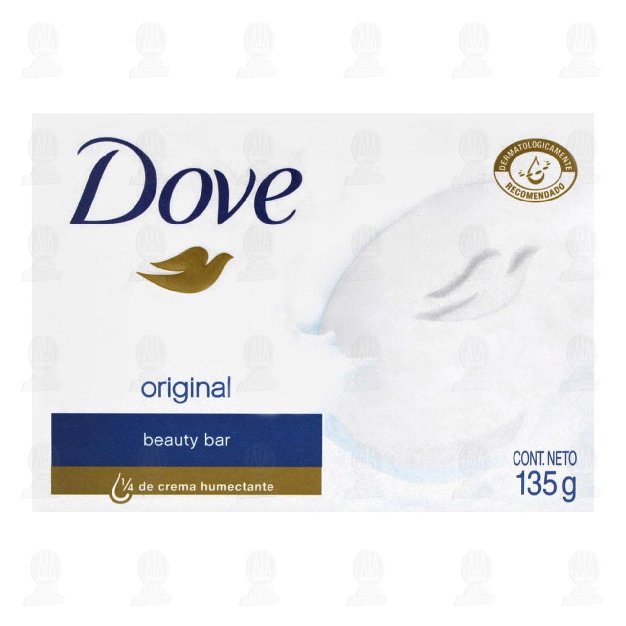 Jabón de tocador compuesto Dove Original en barra, con 1/4 de crema humectante. Contiene 135 gramos.