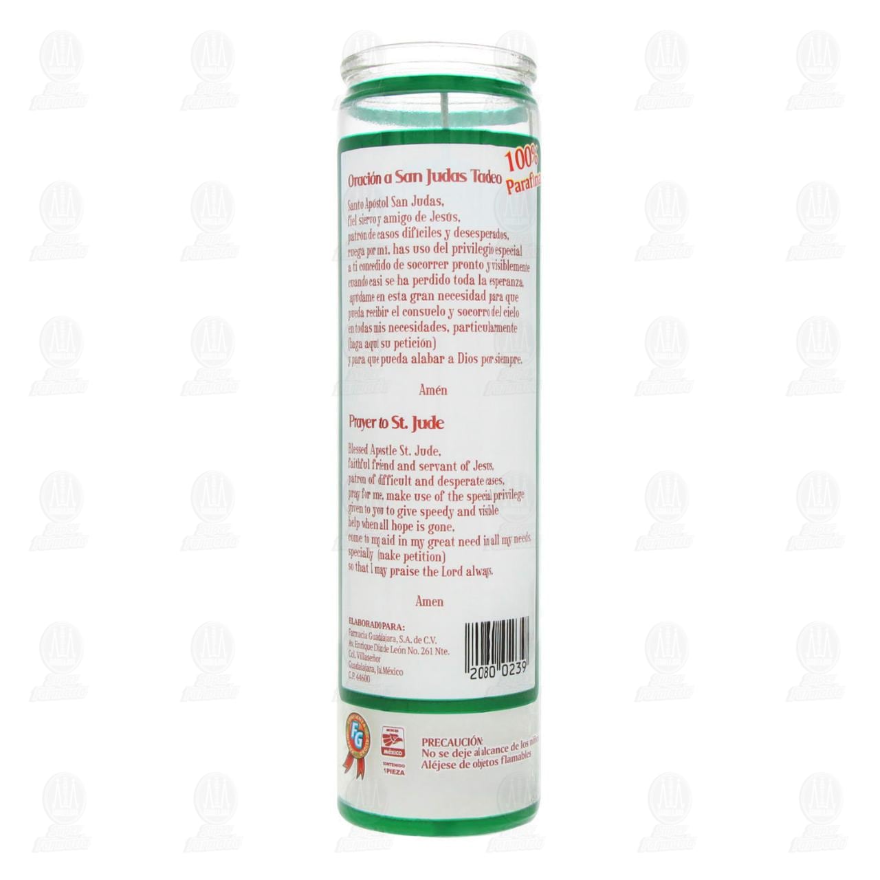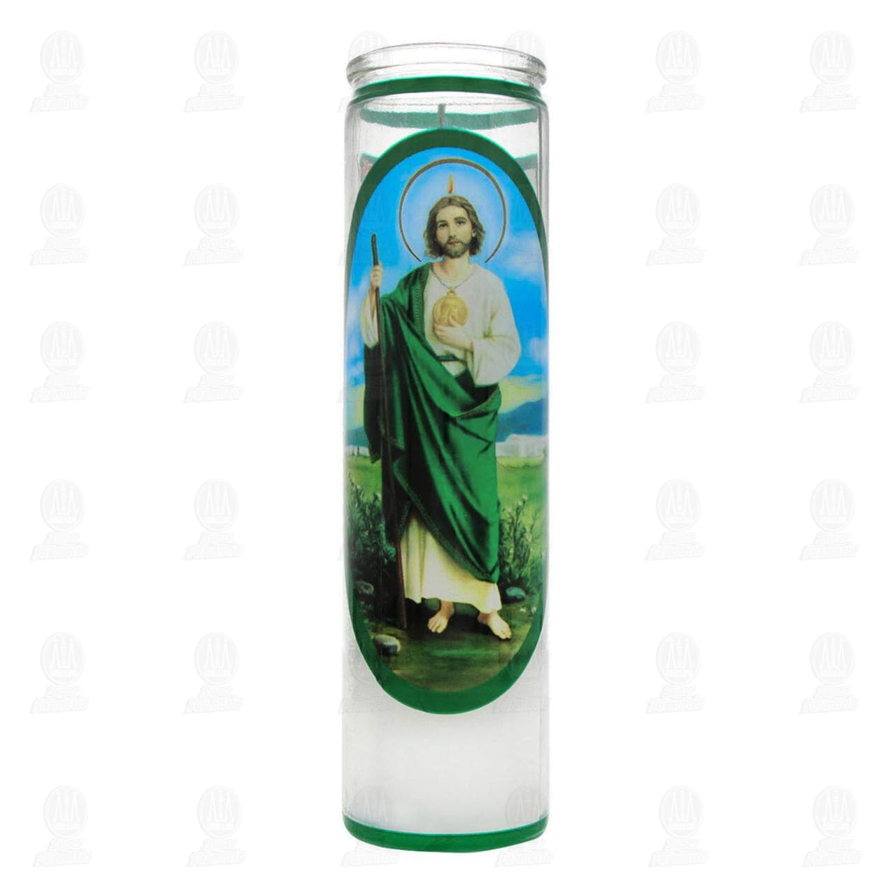 Veladora FG de San Judas Tadeo hecha de parafina, vidrio decorado y cilíndrico. Contiene 1 pieza.