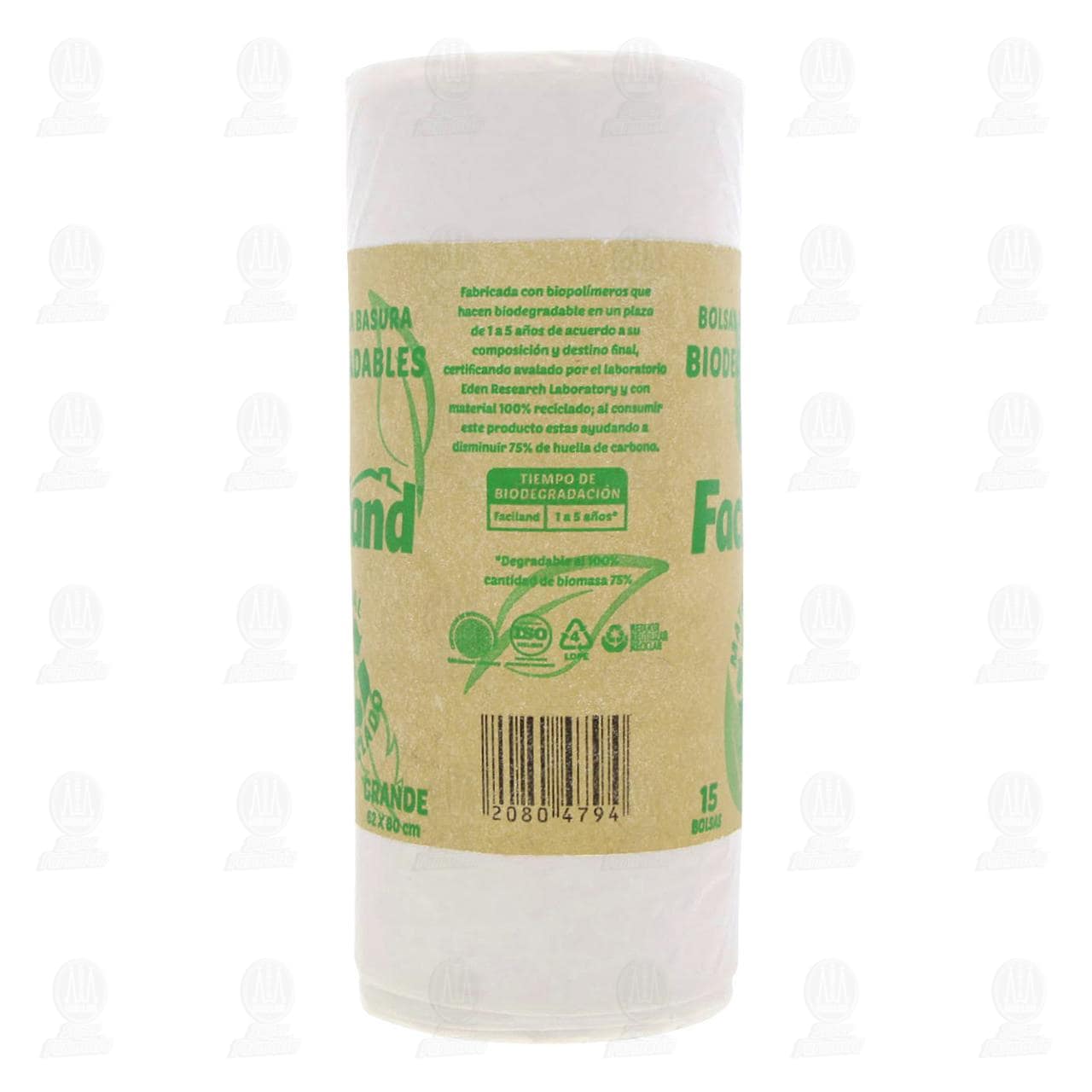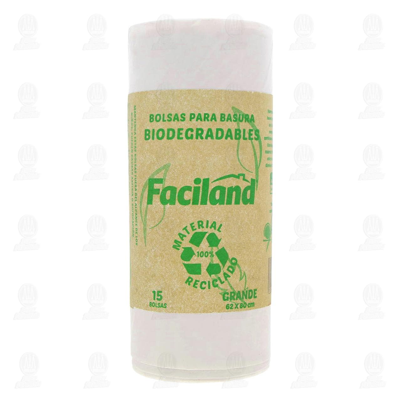 Bolsas desechables Faciland tamaño grande para basura, biodegradables de material 100% reciclado. Contiene 15 piezas de 62 x 80 centímetros cada una.