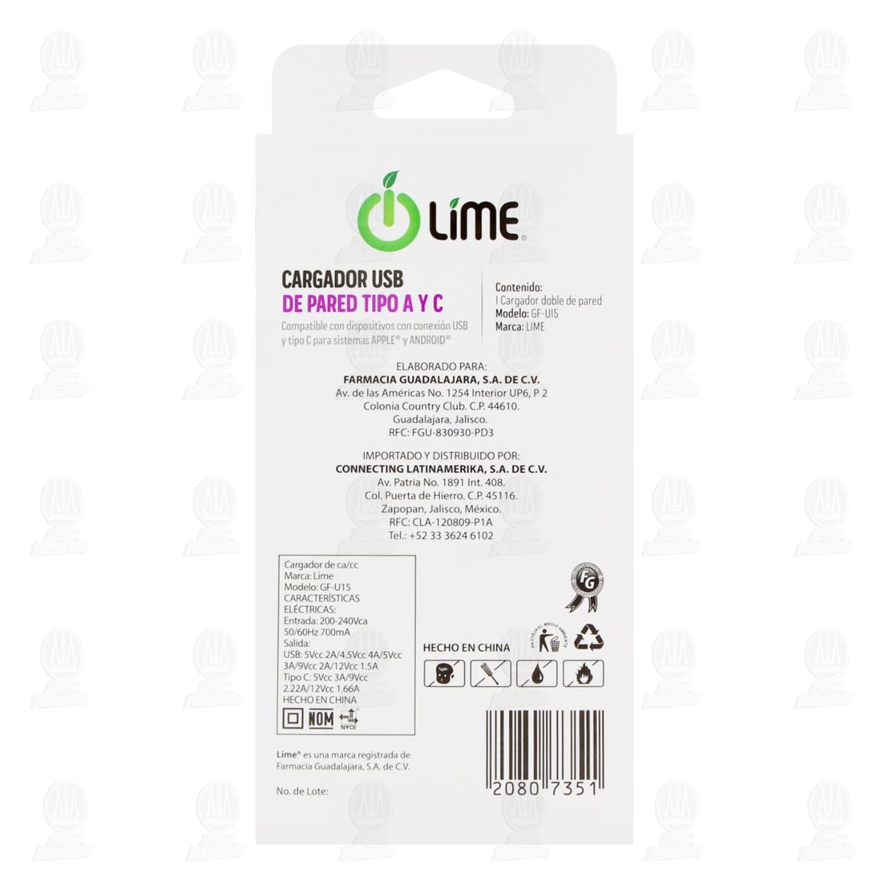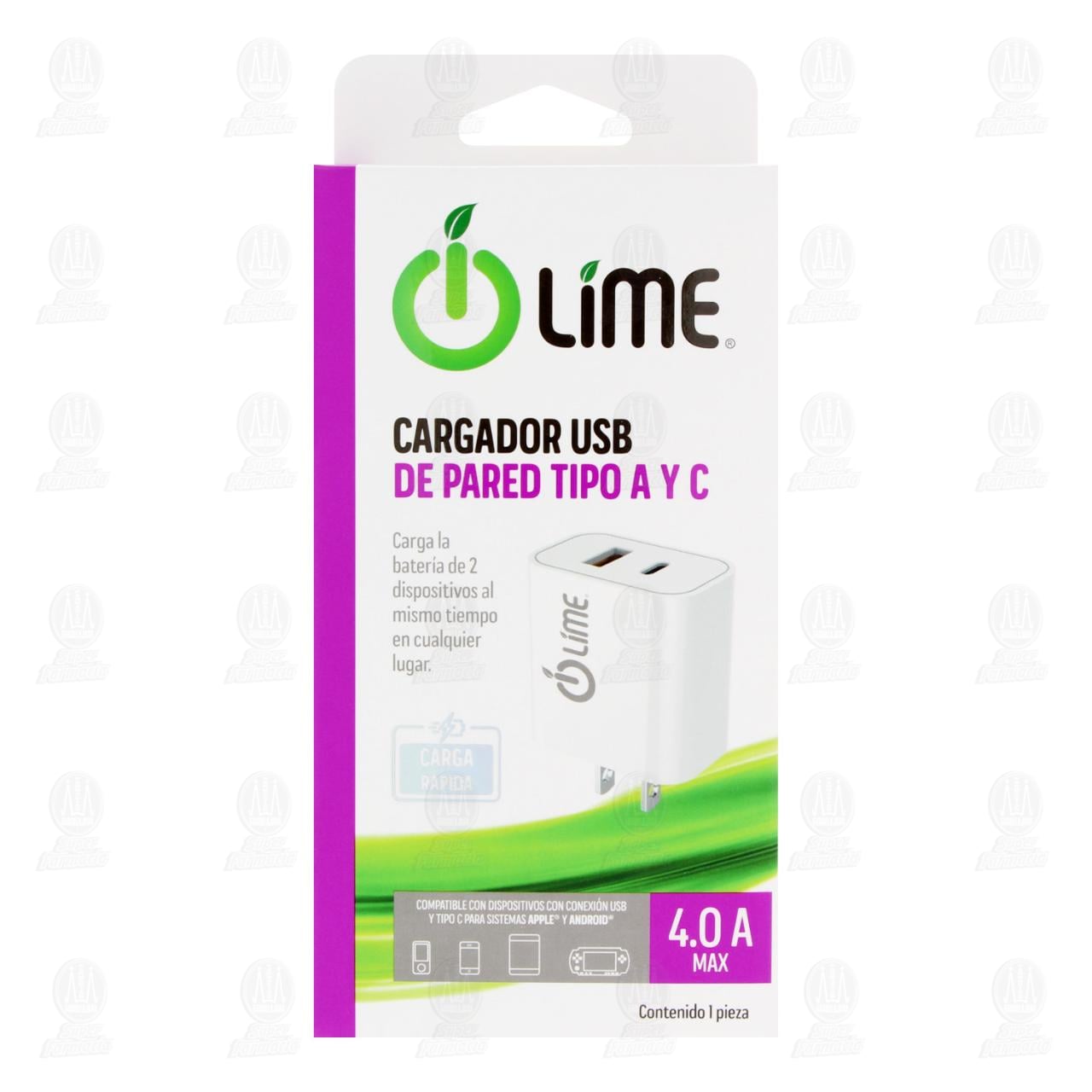 Cargador Lime USB de Pared Tipo A y C, 1 pz.