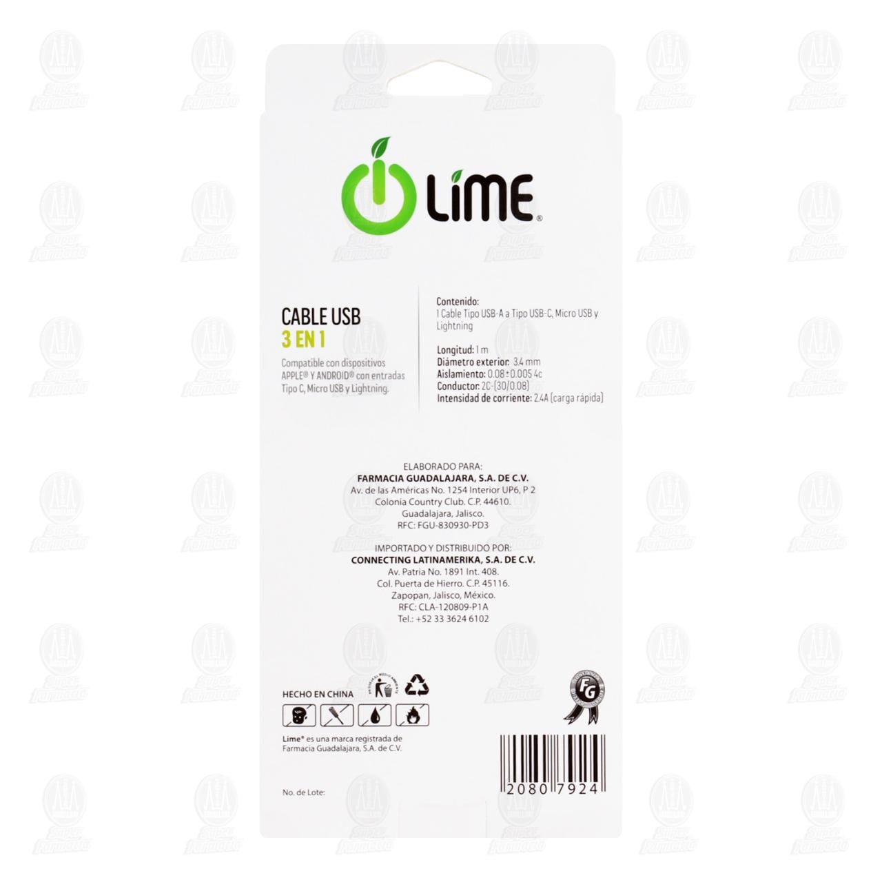 Cable USB 3 en 1 Lime Carga Rápida y Segura para tus Dispositivos Salidas Tipo C, Micro USB y Lightning. Contiene 1 pieza.
