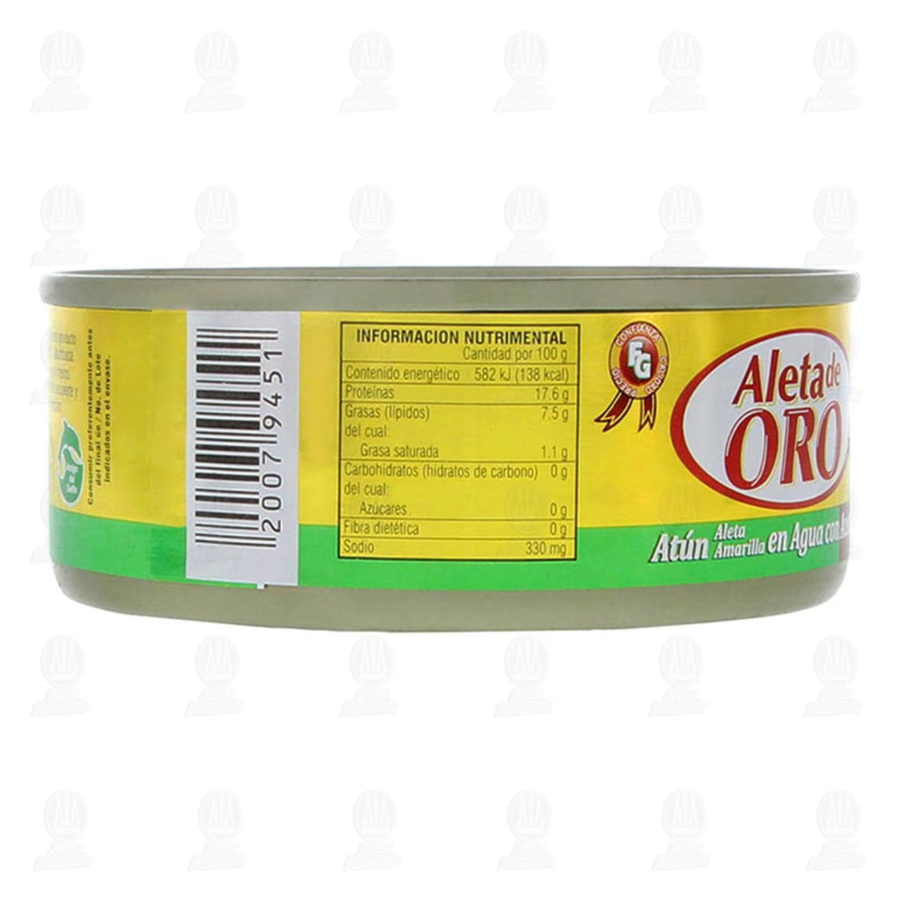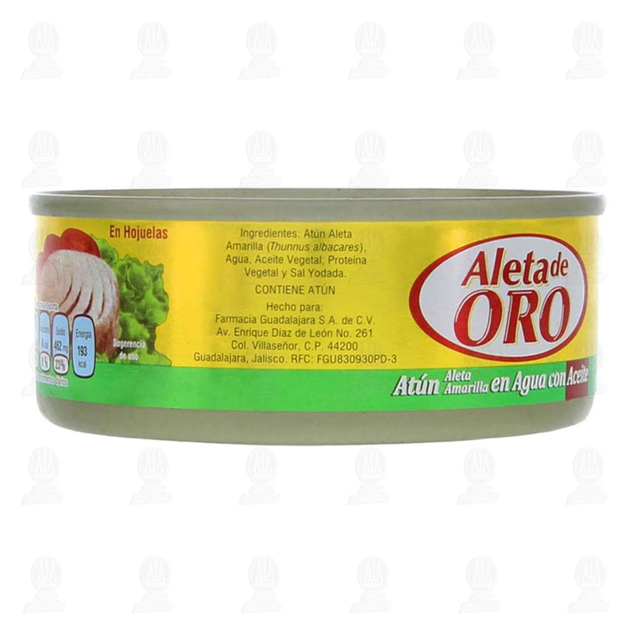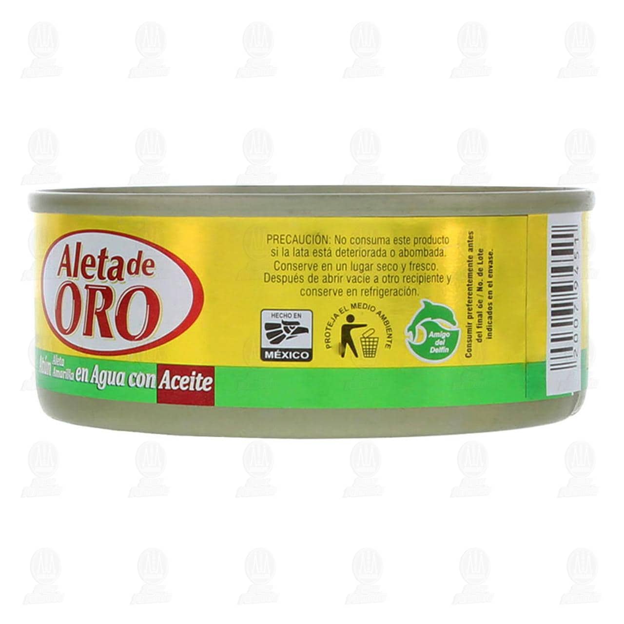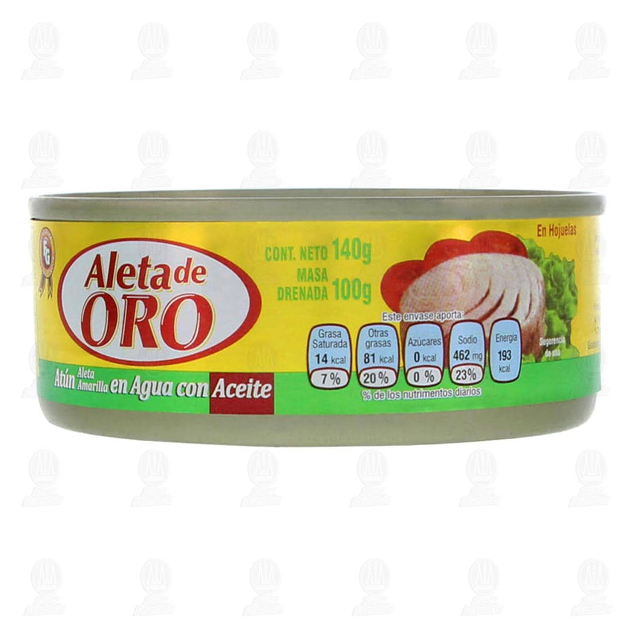 Alimento enlatado Aleta de Oro, atún de aleta amarilla en agua con aceite. Lata con 140 gramos, masa drenada 100 gramos.