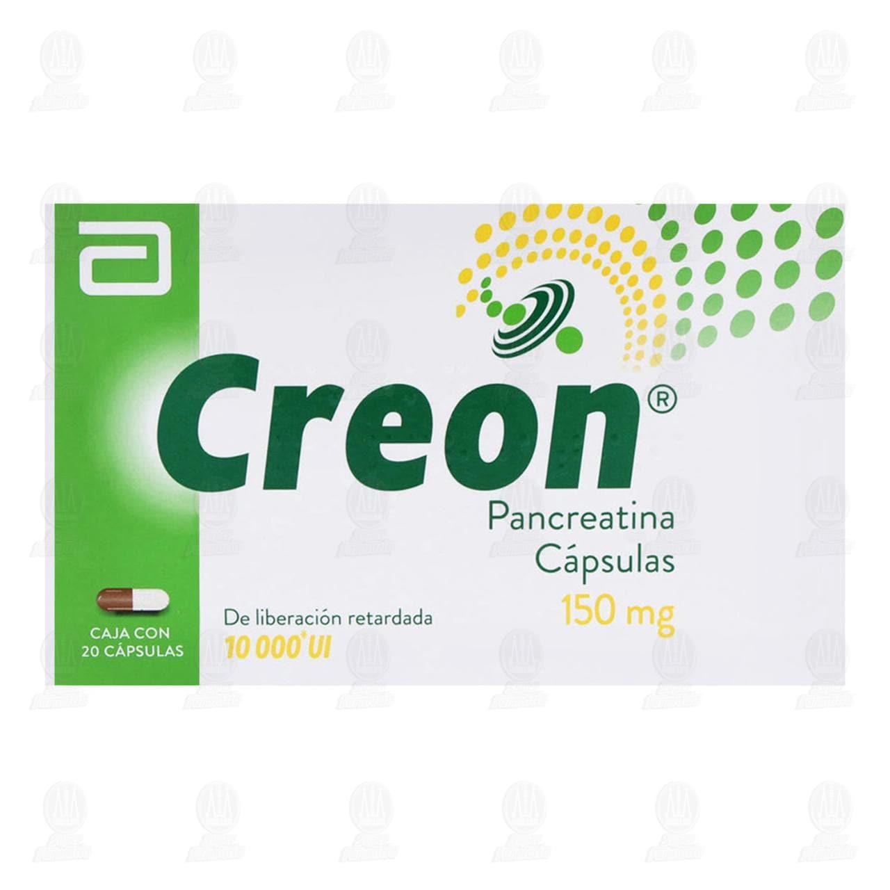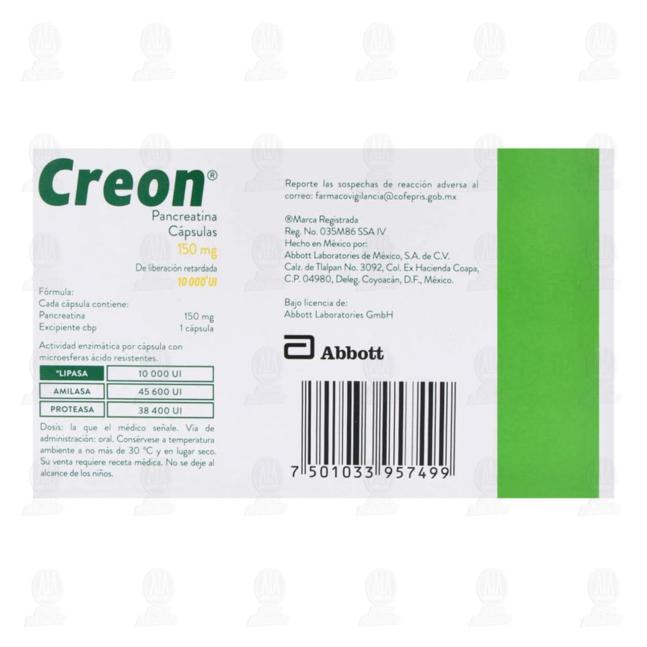 Propiedades farmacodinámicas: CREON® contiene pancreatina porcina formulada como minimicroesferas con cubierta entérica (ácido-resistente), en cápsulas. Las cápsulas se disuelven rápidamente en el estómago, liberando abundantes minimicroesferas, un sistema de dosis múltiple diseñado para lograr una buena mezcla con el quimo, vaciándose del estómago y después liberarse alcanzando una buena distribución de las enzimas. Cuando las minimicroesferas llegan al intestino delgado, el recubrimiento se desintegra rápidamente (a pH > 5.5) para liberar enzimas con actividad lipolítica, amilolítica y proteolítica para garantizar la digestión de grasas, almidones y proteínas. Los productos de la digestión pancreática son luego absorbidos directamente o, después de hidrólisis por las enzimas intestinales.