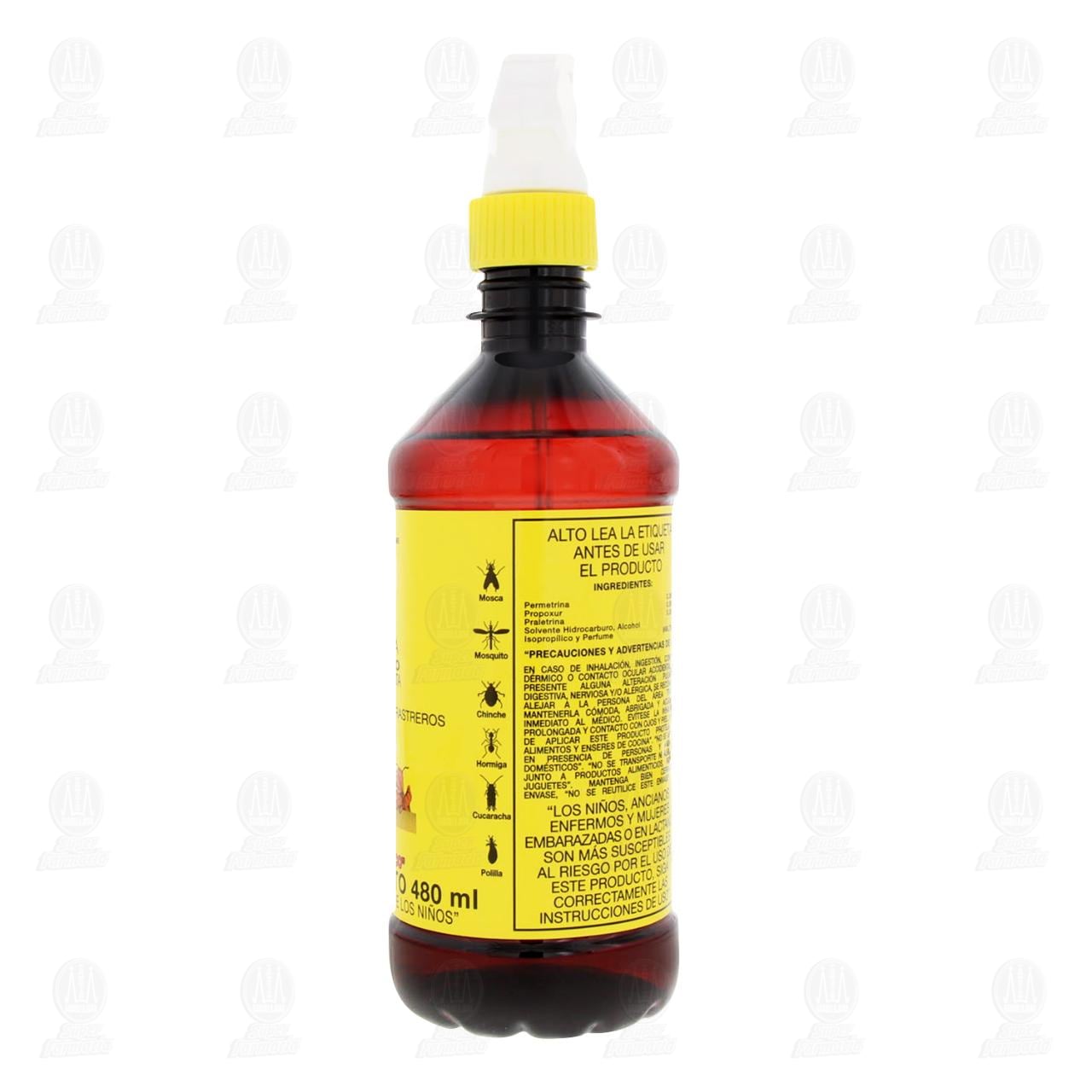 Alto lea la etiqueta antes de usar el producto. En caso de inhalación, ingestión, contacto dérmico o contacto ocular accidental, que presente alguna alteración digestiva, nerviosa y/o alérgica, se recomienda alejar a la persona del área tratada, mantenerla cómoda, abrigada y acudir de inmediato al médico. Evítese la inhalación prolongada y contacto con ojos y piel. "Antes de aplicar este producto proteja los alimentos y enseres de cocina". "No se aplique en presencia de personas y animales domésticos". "No se transporte ni almacene junto a productos alimenticios, ropa o juguetes". Mantenga bien cerrado el envase, "no se reutilice este envase". "Los niños, ancianos, enfermos y mujeres embarazadas o en lactancia son más susceptibles al riesgo por el uso de este producto, siga correctamente las instrucciones de uso". Primero auxilios: en caso de malestar por exposición aguda al producto, "aleje a la persona del área". "En caso de contacto con ojos o piel, lávese con abundante agua", "en caso de malestar por sobreexposición lleve al paciente con el médico y muéstrele esta etiqueta".