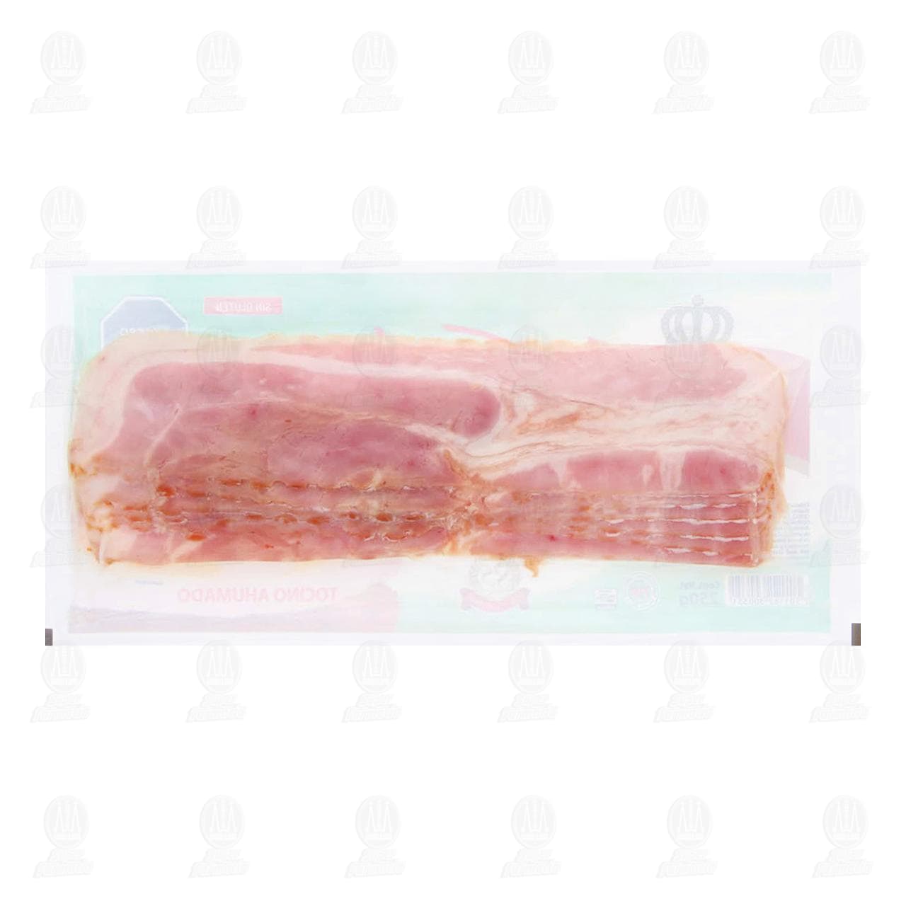 Tocino Corona ahumado rebanado. Paquete con 250 gramos.