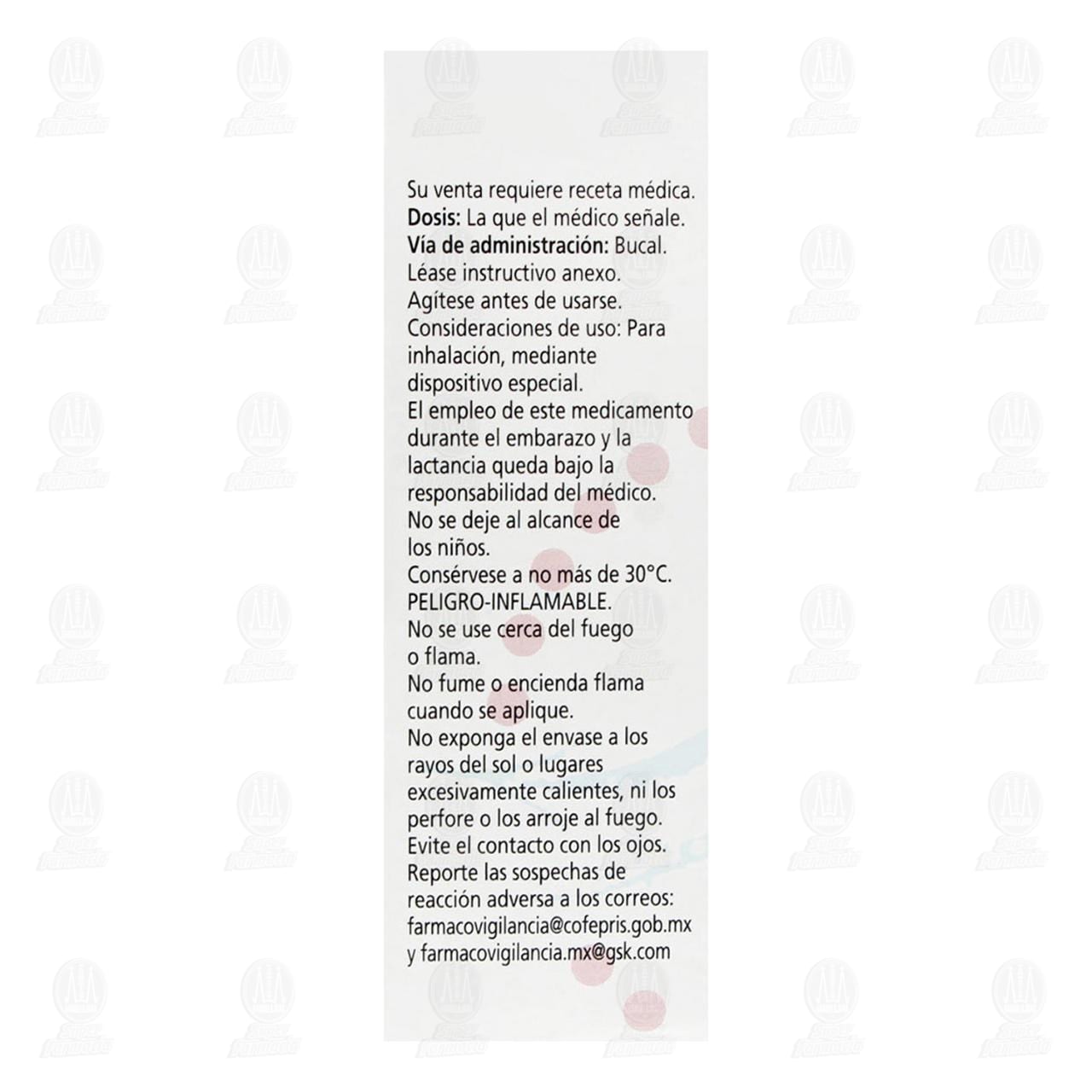 Su venta requiere receta médica. Literatura exclusiva para médicos. No se deje al alcance de los niños. PELIGRO-INFLAMABLE. No se use cerca del fuego o flama. No fume o encienda alguna flama cuando se aplique. No se exponga el envase a los rayos del Sol o lugares excesivamente calientes, ni los perfore o los arroje al fuego. Evite el contacto con los ojos. Como ocurre con la mayoría de los medicamentos para inhalación contenidos en envases presurizados, es posible que el efecto terapéutico de este medicamento disminuya cuando el envase está frío. Envase presurizado. No exponer a temperaturas superiores a 50 °C. El empleo de este medicamento durante el embarazo y la lactancia queda bajo la responsabilidad del médico.